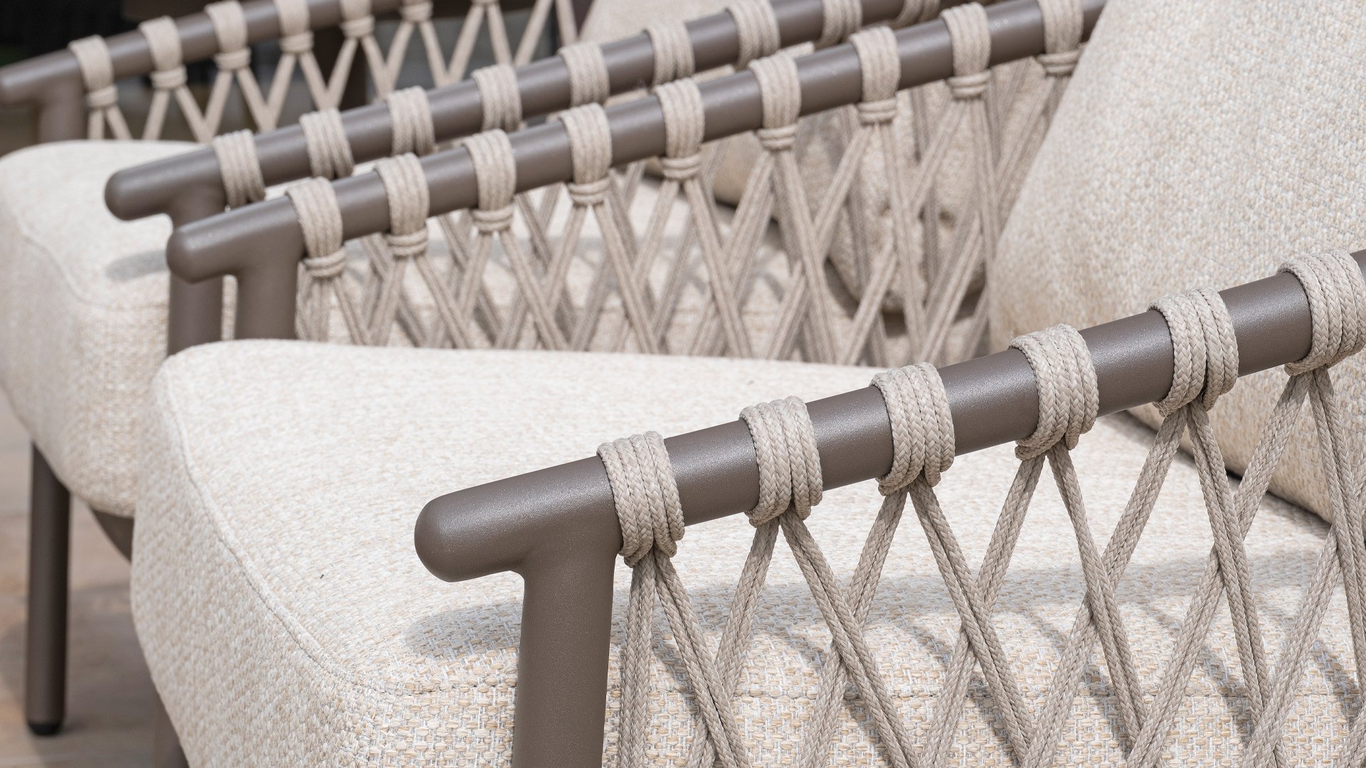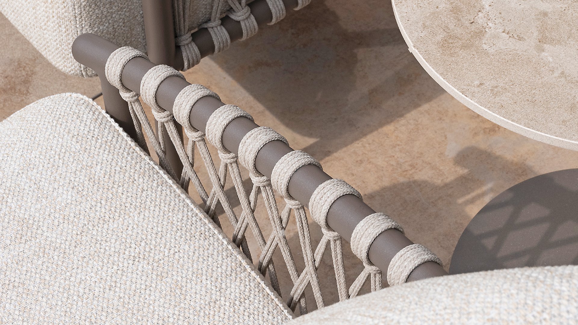 Dieses wunderschöne Material eignet sich perfekt für den Außenbereich, denn Rope ist nicht nur eine normale Spitze, an der Sie Ihre Schuhe binden können. Unsere runden Fäden sind mit einem Kunststoffkern versehen. Diese Basis aus Polypropylen sorgt dafür, dass sich das Rope minimal dehnt und sie nimmt außerdem keine Feuchtigkeit auf. Die Umhüllung besteht aus Acrylstoff, der mit dem wetterfesten Stoff unserer Gartenkissen vergleichbar ist. Diese Umhüllung fühlt sich weich an und ist sehr wasserabweisend, UV-beständig und farbecht. Die flachen Rope-Varianten besitzen den gleichen wetterfesten Materialmix, doch das Polypropylen-Material wurde hier mit dem Acryl-Stoff verwebt. Durch diese Technik besitzt das flache Rope die gleichen Eigenschaften, hat jedoch eine ganz andere Ausstrahlung.