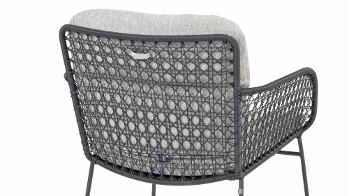 Entdecken Sie die Eleganz und Langlebigkeit des 4 Seasons Outdoor Esszimmerstuhls Aprilla in stilvollem Anthrazit. Dieser Stuhl wird mit Kissen geliefert und hat ein schönes Muster aus anthrazitfarbenem Korbgeflecht und ein anthrazitfarbenes Edelstahlgestell.