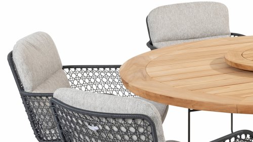 Gartenmöbel aus Teakholz bieten einen atemberaubenden Blick.Teakholz eignet sich besonders gut für den Einsatz im Außenbereich. Es ist resistent gegen Schädlinge und Pilze und widerstandsfähig gegen Sonne, Regen und Schnee. Mit der Zeit entwickelt das Teakholz eine silbergraue Patina. Gartenmöbel aus Teakholz bieten einen atemberaubenden Blick. Darüber hinaus ist es starkes Material und erfordert nur wenig Wartung. Wer die ursprüngliche Farbe des Teakholzes bevorzugt, kann durch regelmäßiges benutzen unser Pflegemittel ganz einfach das Vergrauen des Holzes verhindern.Darüber hinaus können Sie Teak mit grüner Seife reinigen. Durch Temperaturunterschiede und durch den Wechsel von Feuchtigkeit und Trockenheit können kleine Haarrisse entstehen. Es ist üblich, dass Man in dies Unvollkommenheiten findet, diese Unregelmäßigkeiten sind kennzeichnend für dieses Produkt. Diese Unregelmäßigkeiten können nie einen Anlass zu Reklamation, Garantie oder Claim formen. Es betrifft eine Unterschrift von Originalität!  Wir gewähren Garantie auf alle Produktions- und Konstruktionsfehler. Die Wirkung von Teakholz ist nicht enthalten. Wenn Sie sich für Teakholz entscheiden, erwarten wir, dass Sie diese Eigenschaften zu schätzen wissen. Eventuell auftretende Haarrisse, Äste im Teakholz und raue Oberflächen im Laufe der Zeit fallen nicht unter unsere Garantie. Diese Eigenschaften verleihen dem Teakholz seinen eigenen Charakter und sind Teil der Optik. Seien Sie vorsichtig mit einem Blumentopf oder einer Vase auf Ihrem Gartentisch aus Teakholz, da dies zu hartnäckigen Kreisen oder Farbunterschieden führen kann.
