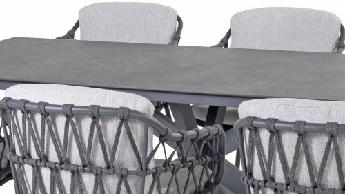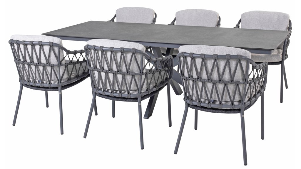 Das Calpi Dining von 4 Seasons Outdoor hat ein zeitgemäßes Design und verleiht jeder Terrasse den hochwertigen Look, den Sie suchen. Die breiten Seilpartien sind auf originelle Weise gewebt und verleihen dem Calpi einen offenen Charakter. Der Calpi wird mit einem Sitz- und Rückenkissen aus wetterfestem Stoff geliefert. Dieser Stoff wirkt wasser- und schmutzabweisend und ist somit widerstandsfähig gegen viele Witterungseinflüsse.