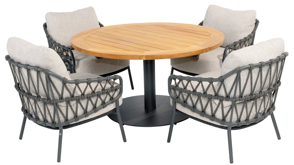 Der niedrige Esstisch 4Seasons Saba hat einen pulverbeschichteten Edelstahlfuß mit einer Tischplatte aus Teakholz. Wir empfehlen die Pflege des Teakholzes mit unseren Pflegeprodukten von 4 Seasons Outdoor, um eine lange Lebensdauer und ein schönes Aussehen zu garantieren. Der Calpi-Stuhl besteht aus einer Edelstahlbasis mit Seilteilen, die gegen verschiedene Witterungseinflüsse beständig sind.