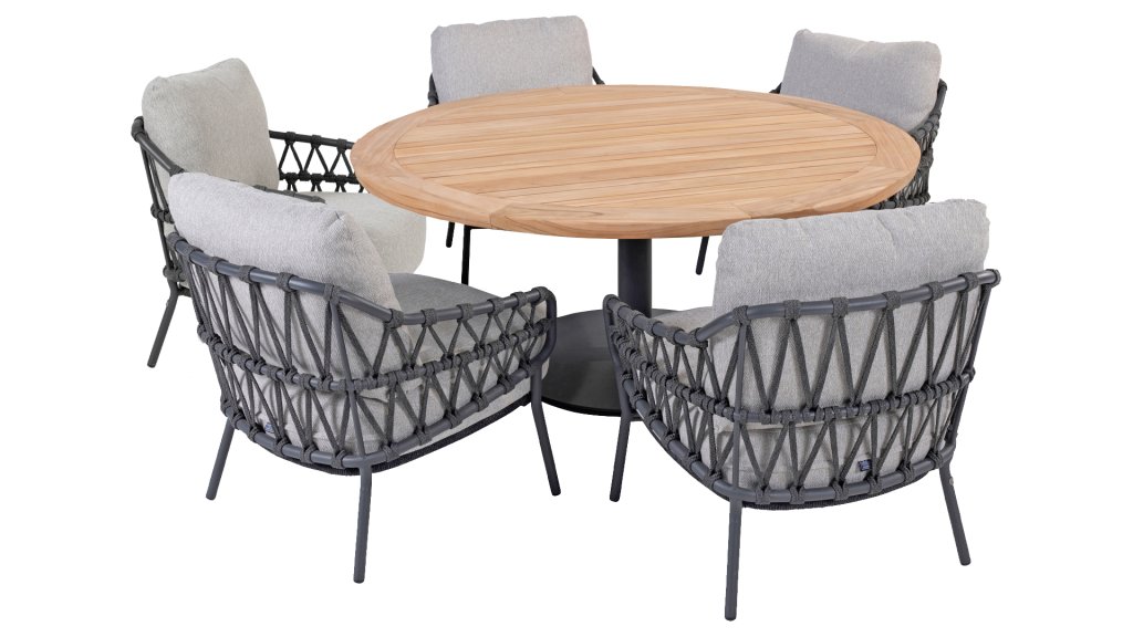 Der niedrige Esstisch 4Seasons Saba hat einen pulverbeschichteten Edelstahlfuß mit einer Tischplatte aus Teakholz. Wir empfehlen die Pflege des Teakholzes mit unseren Pflegeprodukten von 4 Seasons Outdoor, um eine lange Lebensdauer und ein schönes Aussehen zu garantieren. Der Calpi-Stuhl besteht aus einer Edelstahlbasis mit Seilteilen, die gegen verschiedene Witterungseinflüsse beständig sind.