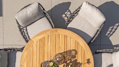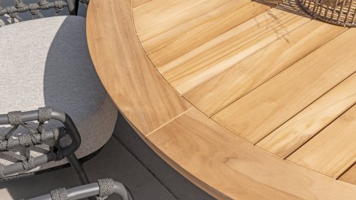 Gartenmöbel aus Teakholz bieten einen atemberaubenden Blick.Teakholz eignet sich besonders gut für den Einsatz im Außenbereich. Es ist resistent gegen Schädlinge und Pilze und widerstandsfähig gegen Sonne, Regen und Schnee. Mit der Zeit entwickelt das Teakholz eine silbergraue Patina. Gartenmöbel aus Teakholz bieten einen atemberaubenden Blick. Darüber hinaus ist es starkes Material und erfordert nur wenig Wartung. Wer die ursprüngliche Farbe des Teakholzes bevorzugt, kann durch regelmäßiges benutzen unser Pflegemittel ganz einfach das Vergrauen des Holzes verhindern.Darüber hinaus können Sie Teak mit grüner Seife reinigen. Durch Temperaturunterschiede und durch den Wechsel von Feuchtigkeit und Trockenheit können kleine Haarrisse entstehen. Es ist üblich, dass Man in dies Unvollkommenheiten findet, diese Unregelmäßigkeiten sind kennzeichnend für dieses Produkt. Diese Unregelmäßigkeiten können nie einen Anlass zu Reklamation, Garantie oder Claim formen. Es betrifft eine Unterschrift von Originalität!  Wir gewähren Garantie auf alle Produktions- und Konstruktionsfehler. Die Wirkung von Teakholz ist nicht enthalten. Wenn Sie sich für Teakholz entscheiden, erwarten wir, dass Sie diese Eigenschaften zu schätzen wissen. Eventuell auftretende Haarrisse, Äste im Teakholz und raue Oberflächen im Laufe der Zeit fallen nicht unter unsere Garantie. Diese Eigenschaften verleihen dem Teakholz seinen eigenen Charakter und sind Teil der Optik. Seien Sie vorsichtig mit einem Blumentopf oder einer Vase auf Ihrem Gartentisch aus Teakholz, da dies zu hartnäckigen Kreisen oder Farbunterschieden führen kann.