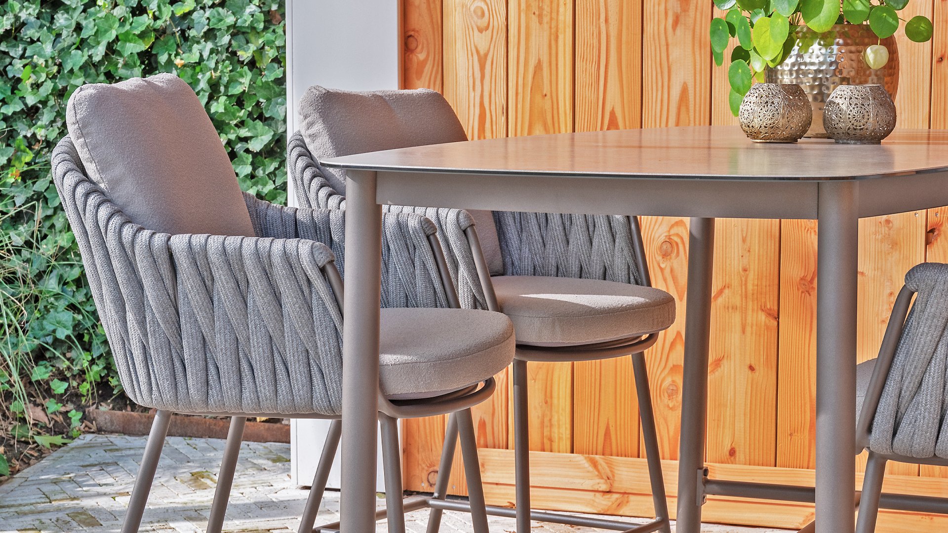 Was diesen Stuhl wirklich einzigartig macht, ist die Kombination aus taupefarbenen Kissen und einem terrefarbenen Gestell, die ihm einen warmen und eleganten Look verleiht, der zu verschiedenen Außenumgebungen passt. Die Kissen sind mit Bouclé gepolstert, einem luxuriösen Stoff, der sich weich und angenehm anfühlt und gleichzeitig Olefin enthält – ein Material, das sehr resistent gegen Verfärbungen durch Sonnenlicht und wetterbeständig ist. Das macht den 4Seasons Capalbio Counter Chair nicht nur schön, sondern auch praktisch und pflegeleicht. Das Capalbio bietet einige Optionen, die folgenden Varianten sind in dieser Serie erhältlich: Loungegruppe, Esstisch set, Low-dining set und Counterset.