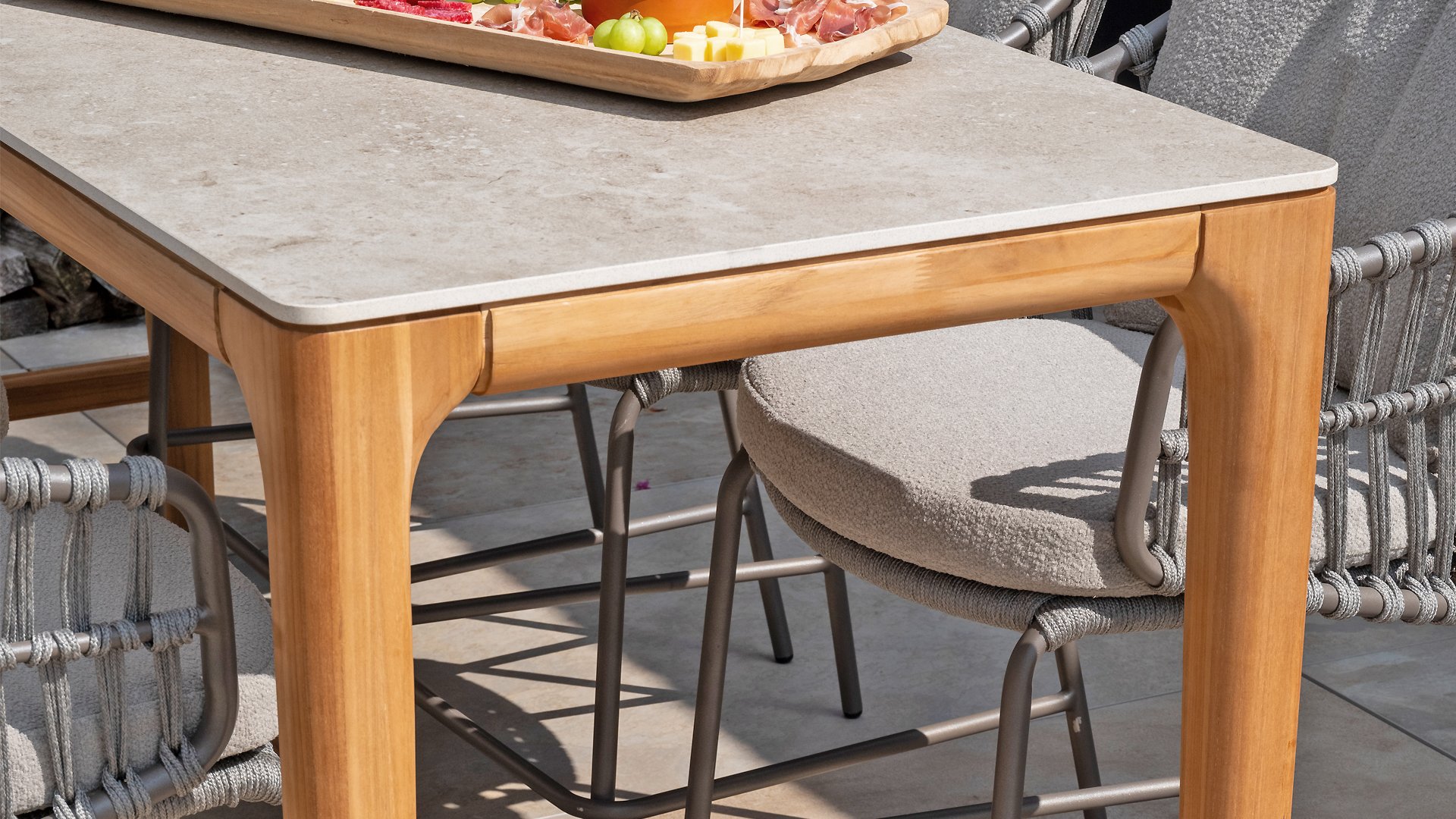 Das Untergestell aus Teakholz verleiht dem Tisch nicht nur ein warmes und natürliches Aussehen, sondern sorgt auch für Langlebigkeit und Stabilität. Teakholz ist für seine Witterungsbeständigkeit bekannt und eignet sich daher hervorragend für den Einsatz in verschiedenen Umgebungen. Die Kombination aus dem stabilen Teakholzgestell und der eleganten Keramikplatte macht den Liam-Tisch zu einem Hingucker in jedem Raum, während das funktionale Design zu einem komfortablen Esserlebnis beiträgt. In dieser Serie sind außerdem zwei Tische mit 180cm und 240cm erhältlich, die vollständig aus Teakholz gefertigt sind, sowie ein 240cm Keramik großer im gleichen Konzept wie der Liam Counter.
