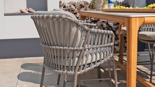Was diesen Stuhl wirklich einzigartig macht, ist die Kombination aus taupefarbenen Kissen und einem terrefarbenen Gestell, die ihm einen warmen und eleganten Look verleiht, der zu verschiedenen Außenumgebungen passt. Die Kissen sind mit Bouclé gepolstert, einem luxuriösen Stoff, der sich weich und angenehm anfühlt und gleichzeitig Olefin enthält – ein Material, das sehr resistent gegen Verfärbungen durch Sonnenlicht und wetterbeständig ist. Das macht den 4Seasons Capalbio Counter Chair nicht nur schön, sondern auch praktisch und pflegeleicht. Das Capalbio bietet einige Optionen, die folgenden Varianten sind in dieser Serie erhältlich: Loungegruppe, Esstisch set, Low-dining set und Counterset.
