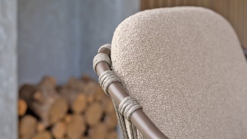 Das taupefarbene Kissen, bezogen mit luxuriöser Bouclé-Polsterung, lädt zum Entspannen ein. Dieser Stoff ist nicht nur schön anzusehen, sondern auch wunderbar zum Sitzen.