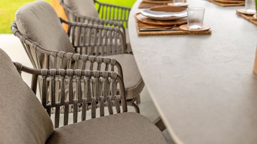 Der 4SO Capalbio Gartenstuhl ist eine stilvolle Ergänzung für Ihren Außenbereich, mit einem eleganten Design, das sowohl Komfort als auch Ästhetik bietet. Die Basis ist in einem warmen Terrabraun gehalten, was für einen natürlichen Look sorgt. Der Stuhl ist außerdem mit einem grauen Seil versehen, das ihm eine moderne Note verleiht und für einen bequemen Sitz sorgt. Das taupefarbene Kissen, bezogen mit luxuriöser Bouclé-Polsterung, lädt zum Entspannen ein. Dieser Stoff ist nicht nur schön anzusehen, sondern auch wunderbar zum Sitzen. Die folgenden Varianten sind in dieser Serie erhältlich: Loungegruppe, Esstisch set, Low-dining set und Counterset, sodass Sie in Ihrem Garten oder auf Ihrer Terrasse ein einheitliches Erscheinungsbild schaffen können. Perfekt für gemütliche Abendessen oder entspannte Momente im Freien!