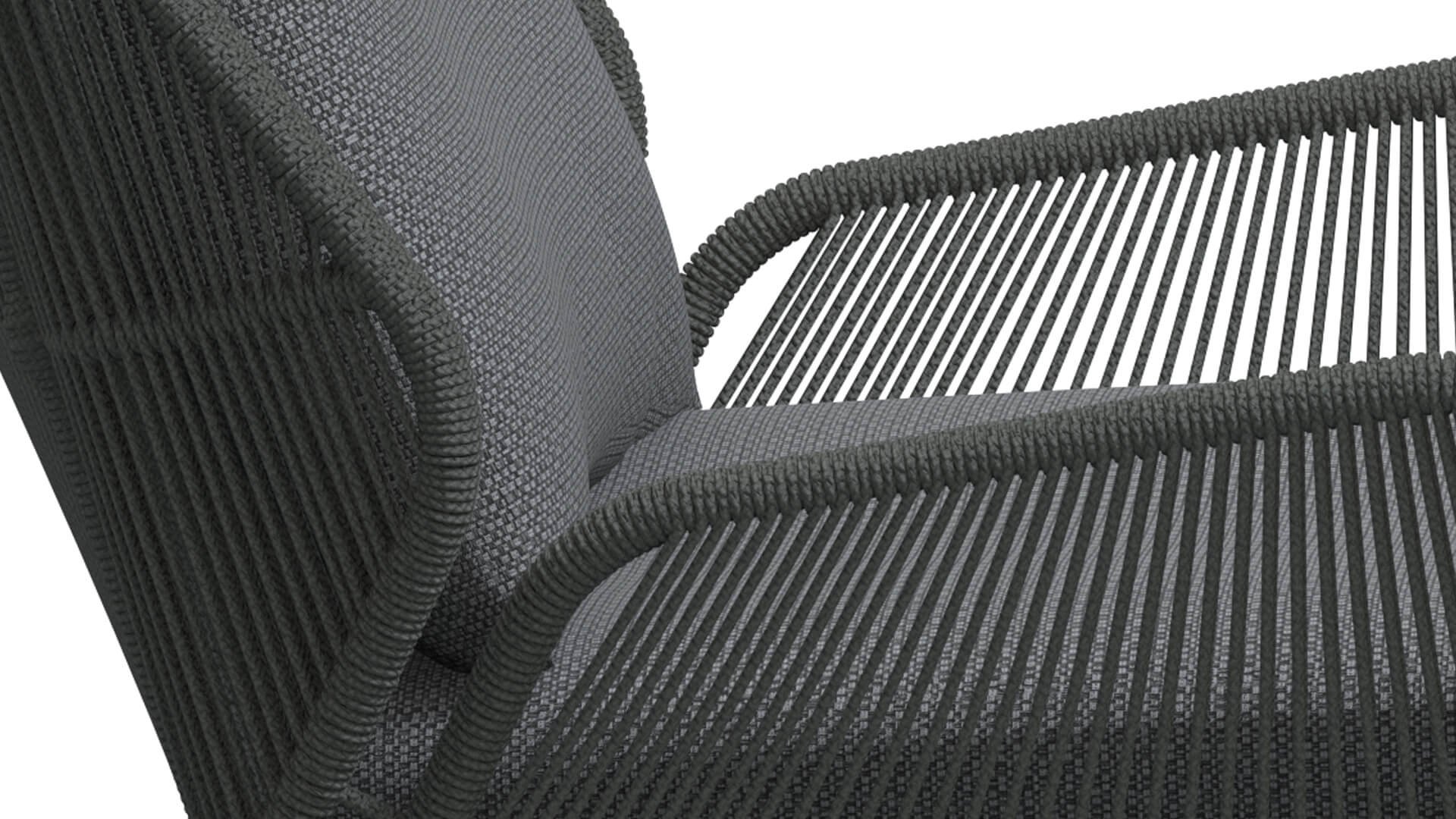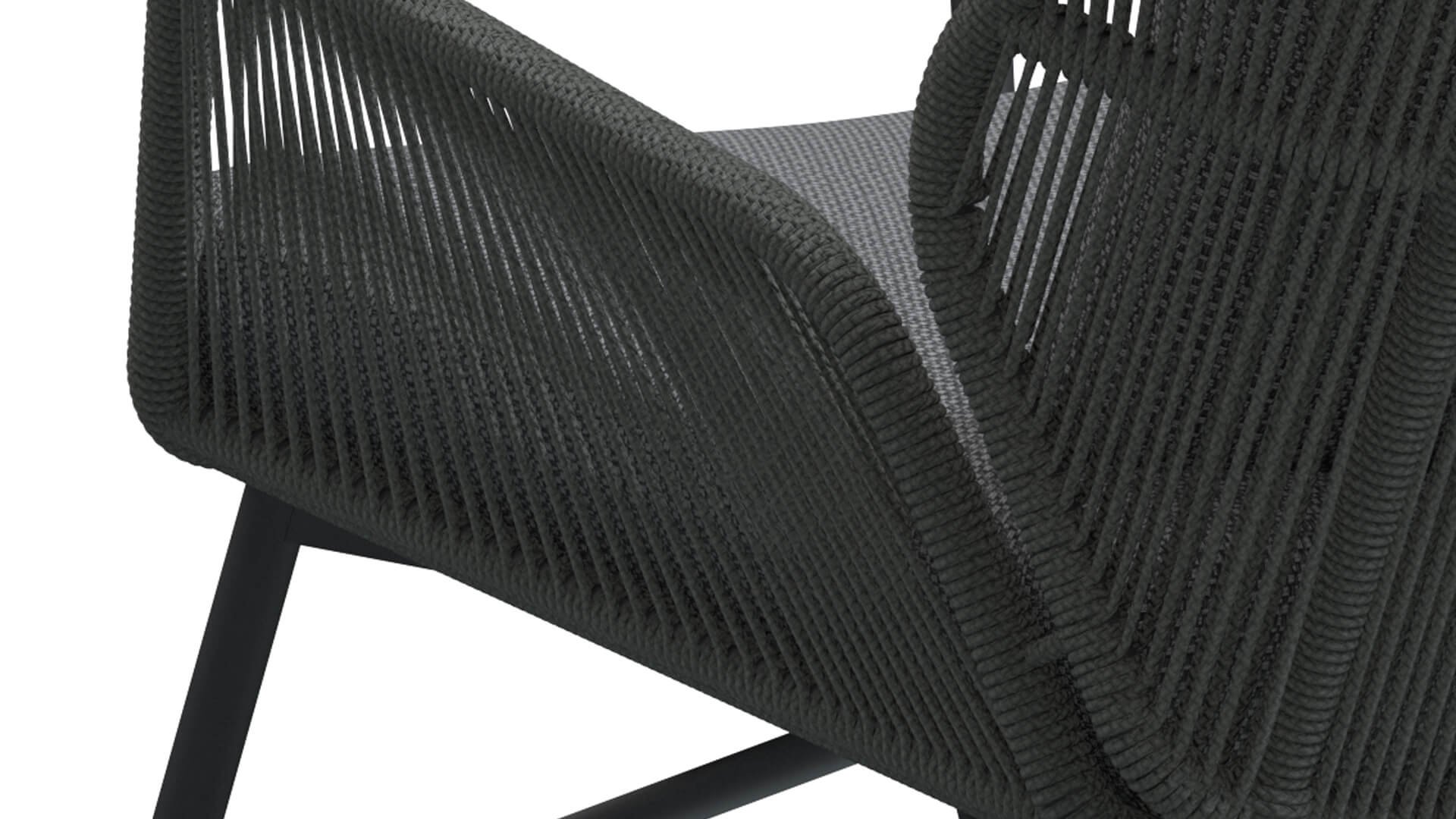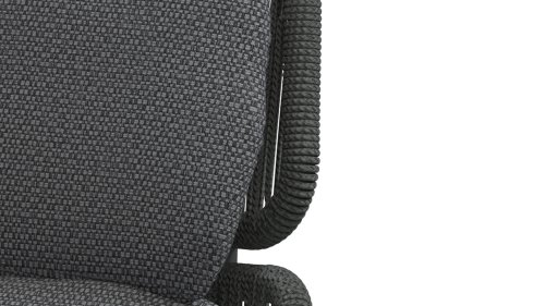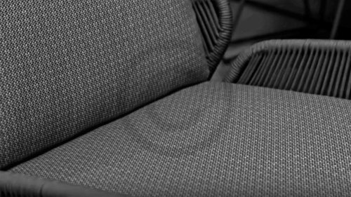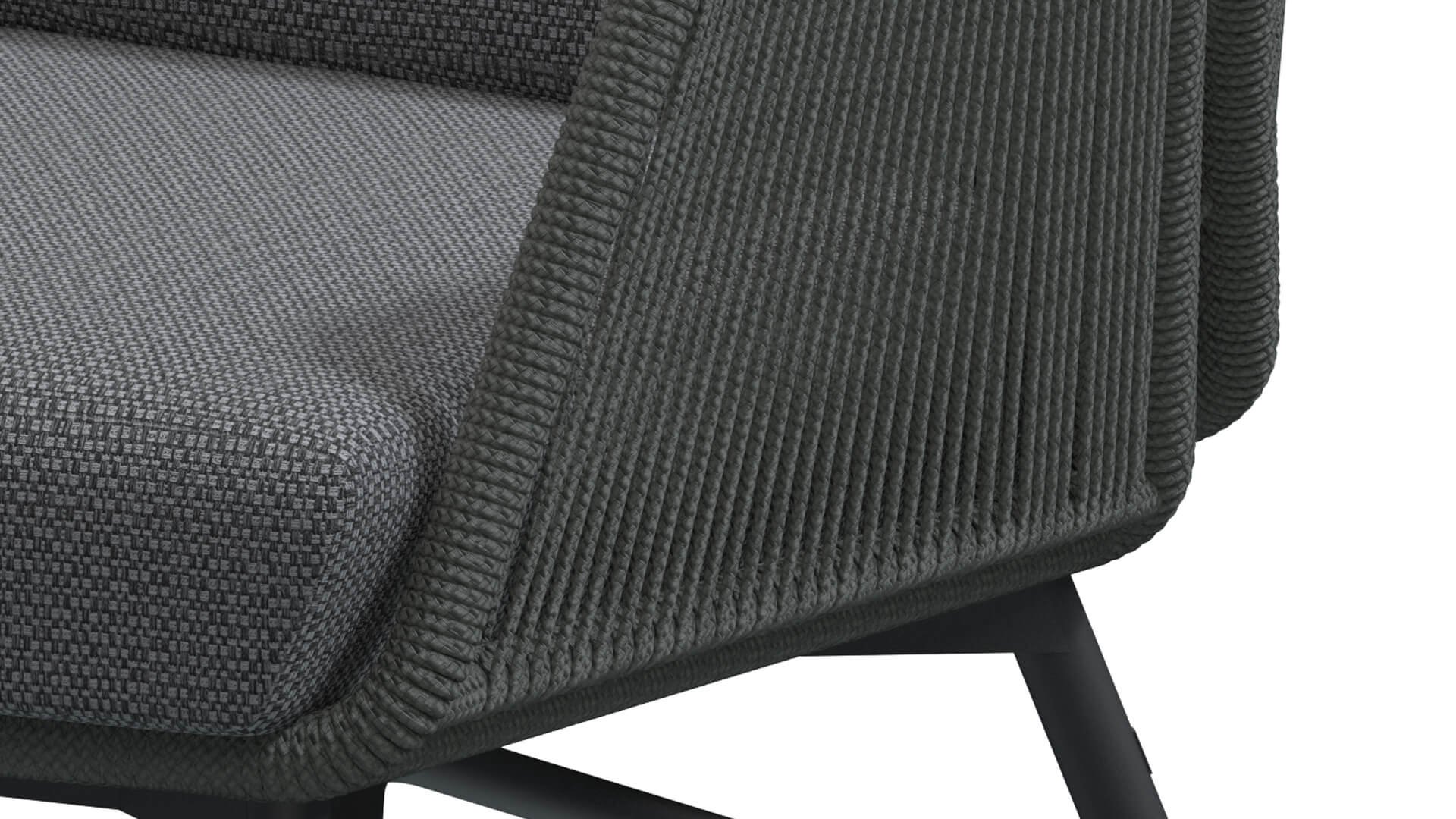 Das erste, was Ihnen sofort auffällt, ist, dass die Carthago Lounge-Serie einen hohen Rücken einschließlich Kopfstütze hat. Dies stellt sicher, dass Ihr Rücken und Ihr Kopf vollständig unterstützt werden. Die Kissen sind wunderbar weich und bequem. Der Rückenteil kommt seitlich nach vorne, dies hat den Vorteil, dass das Rückenkissen fest an Ort und Stelle bleibt und das "Kokonieren" noch stärker betont. Mit "Kokonieren" meinen wir die Schaffung eines privaten, geschlossenen Raums. Dies spiegelt sich auch im Loungesofa wider. Die Armlehnen runden das Konzept weiter ab und passen das Design genau zur Rückenlehne. Das fest gespannte Seil erzeugt ein vertikales Muster, das besonders auf der Stuhllehne sichtbar ist. Die passenden Kissen in der gleichen Farbe sind wunderbar dick und garantieren viele entspannende Stunden.