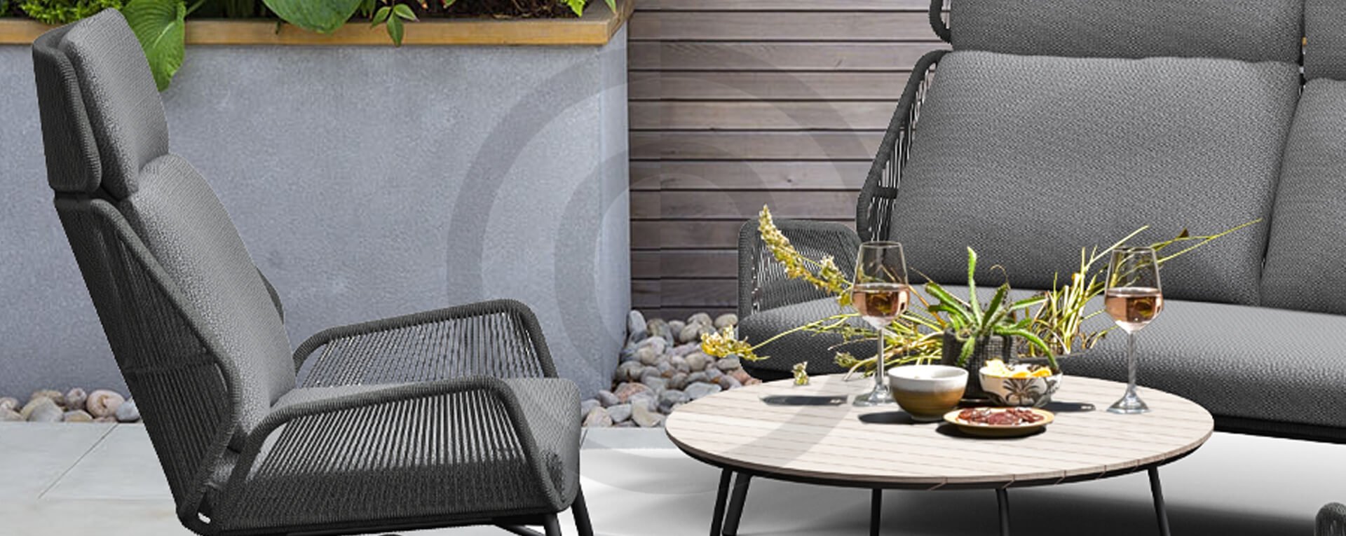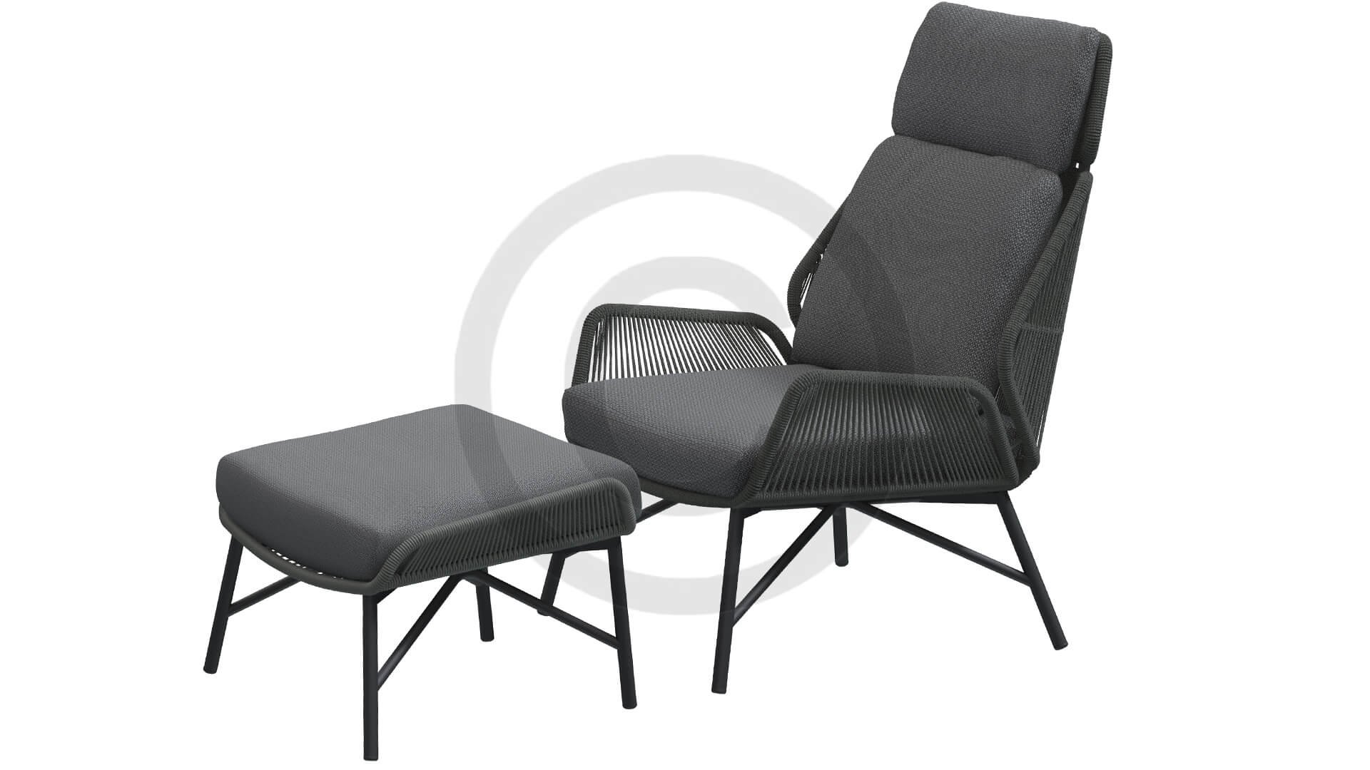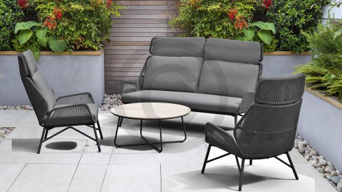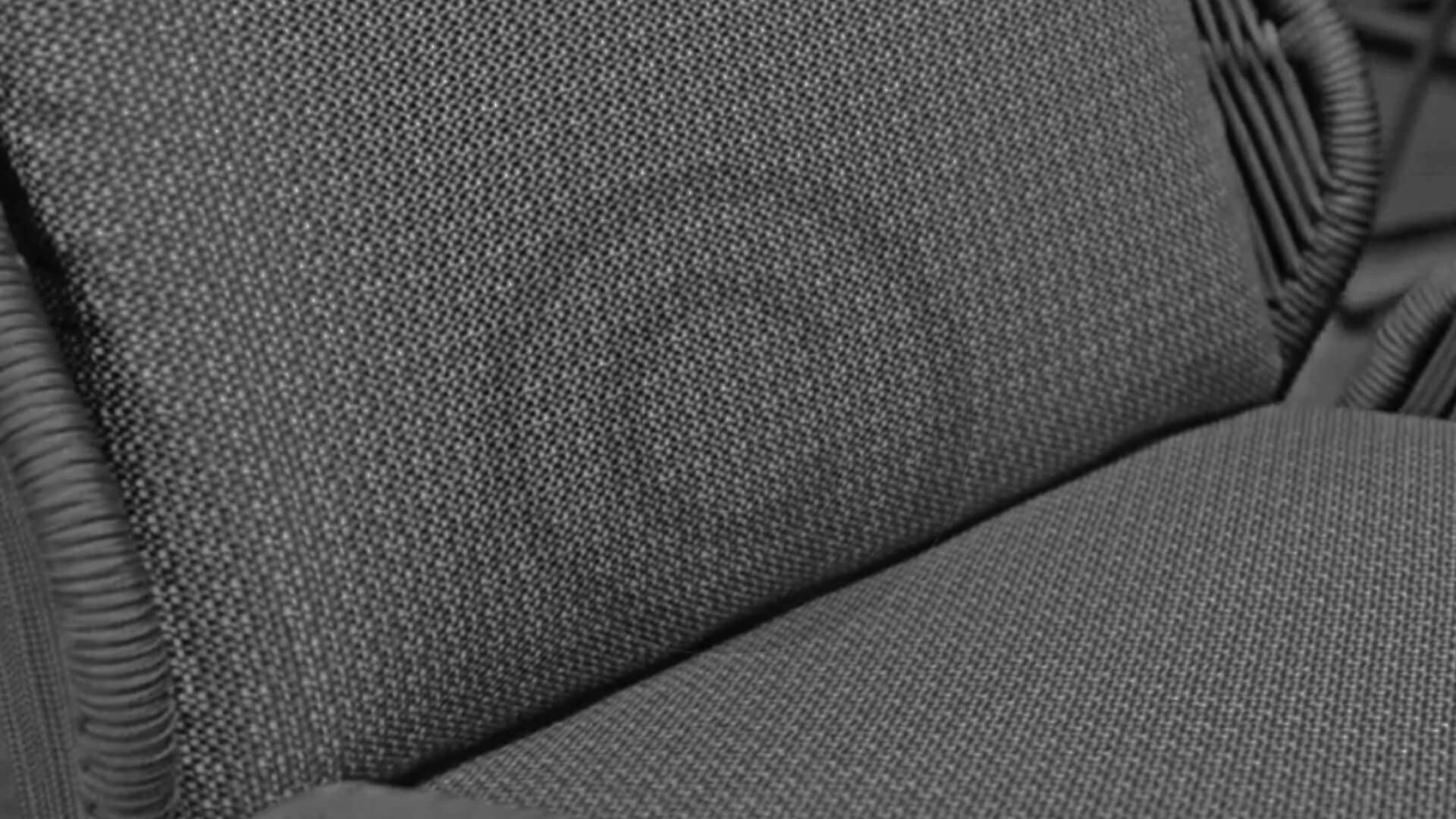 Das erste, was Ihnen sofort auffällt, ist, dass die Carthago Lounge-Serie einen hohen Rücken einschließlich Kopfstütze hat. Dies stellt sicher, dass Ihr Rücken und Ihr Kopf vollständig unterstützt werden. Die Kissen sind wunderbar weich und bequem. Der Rückenteil kommt seitlich nach vorne, dies hat den Vorteil, dass das Rückenkissen fest an Ort und Stelle bleibt und das "Kokonieren" noch stärker betont. Mit "Kokonieren" meinen wir die Schaffung eines privaten, geschlossenen Raums. Dies spiegelt sich auch im Loungesofa wider. Die Armlehnen runden das Konzept weiter ab und passen das Design genau zur Rückenlehne. Das fest gespannte Seil erzeugt ein vertikales Muster, das besonders auf der Stuhllehne sichtbar ist. Die passenden Kissen in der gleichen Farbe sind wunderbar dick und garantieren viele entspannende Stunden.