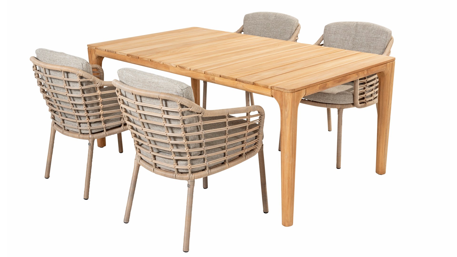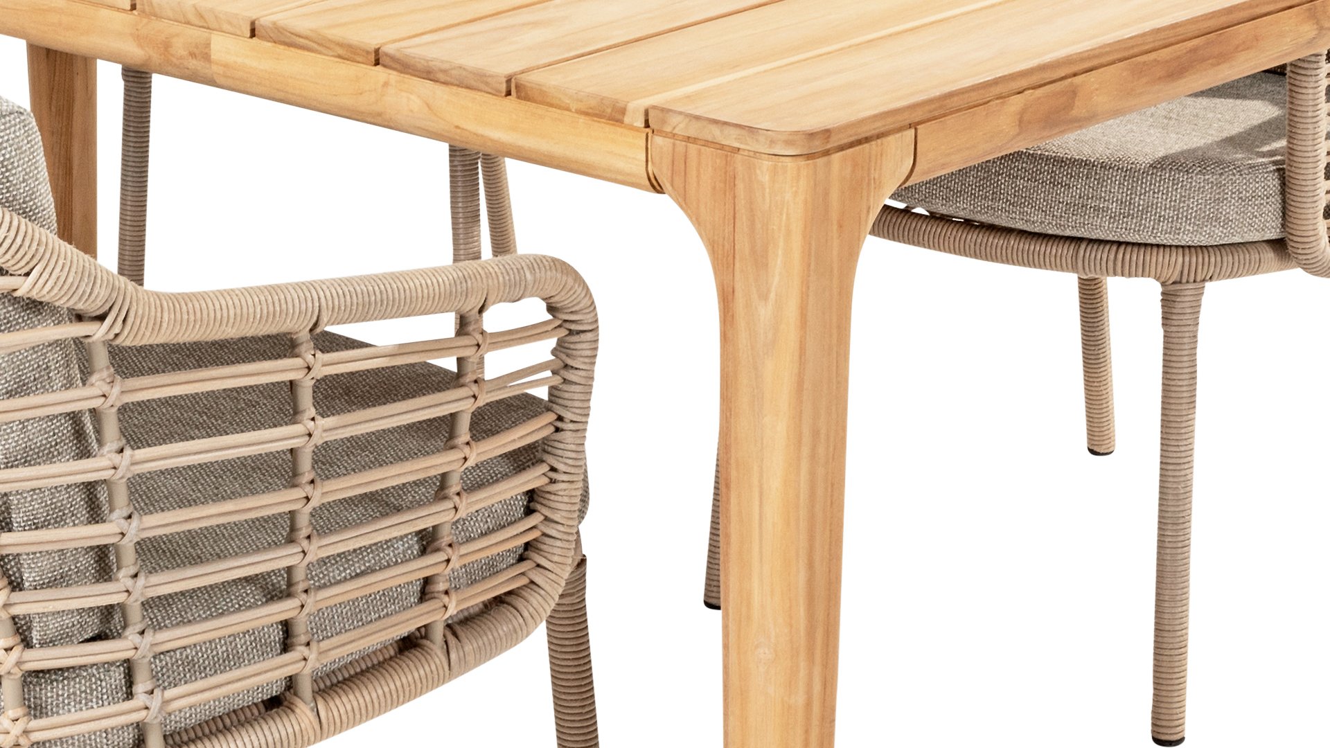 Gartenmöbel aus Teakholz bieten einen atemberaubenden Blick.Teakholz eignet sich besonders gut für den Einsatz im Außenbereich. Es ist resistent gegen Schädlinge und Pilze und widerstandsfähig gegen Sonne, Regen und Schnee. Mit der Zeit entwickelt das Teakholz eine silbergraue Patina. Gartenmöbel aus Teakholz bieten einen atemberaubenden Blick. Darüber hinaus ist es starkes Material und erfordert nur wenig Wartung. Wer die ursprüngliche Farbe des Teakholzes bevorzugt, kann durch regelmäßiges benutzen unser Pflegemittel ganz einfach das Vergrauen des Holzes verhindern.Darüber hinaus können Sie Teak mit grüner Seife reinigen. Durch Temperaturunterschiede und durch den Wechsel von Feuchtigkeit und Trockenheit können kleine Haarrisse entstehen. Es ist üblich, dass Man in dies Unvollkommenheiten findet, diese Unregelmäßigkeiten sind kennzeichnend für dieses Produkt. Diese Unregelmäßigkeiten können nie einen Anlass zu Reklamation, Garantie oder Claim formen. Es betrifft eine Unterschrift von Originalität!  Wir gewähren Garantie auf alle Produktions- und Konstruktionsfehler. Die Wirkung von Teakholz ist nicht enthalten. Wenn Sie sich für Teakholz entscheiden, erwarten wir, dass Sie diese Eigenschaften zu schätzen wissen. Eventuell auftretende Haarrisse, Äste im Teakholz und raue Oberflächen im Laufe der Zeit fallen nicht unter unsere Garantie. Diese Eigenschaften verleihen dem Teakholz seinen eigenen Charakter und sind Teil der Optik. Seien Sie vorsichtig mit einem Blumentopf oder einer Vase auf Ihrem Gartentisch aus Teakholz, da dies zu hartnäckigen Kreisen oder Farbunterschieden führen kann.