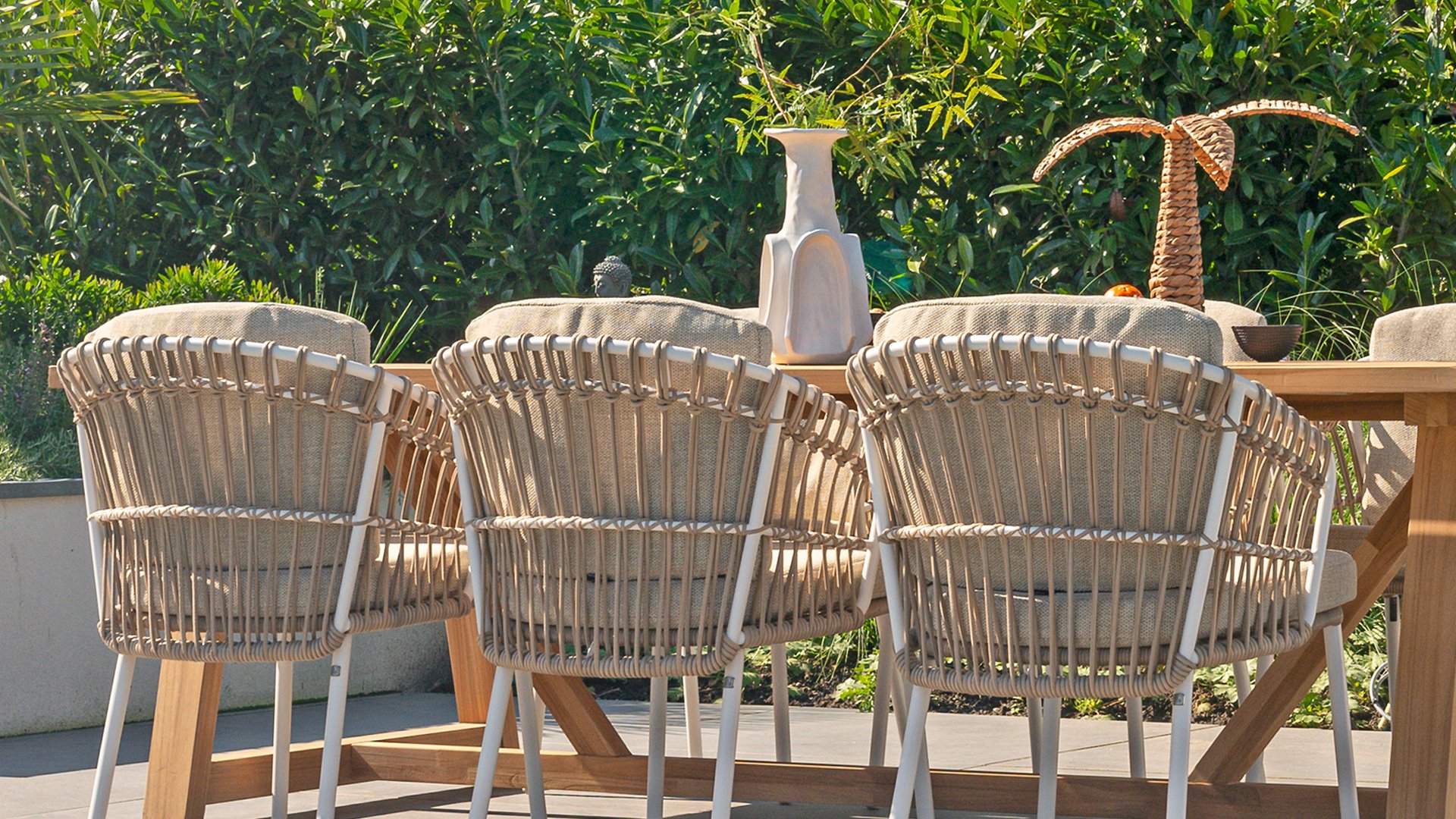 Weiße Dalias am Strand. Schließen Sie die Augen und stellen Sie sich vor, Sie wären auf Ibiza. Die sommerliche Atmosphäre, die die 4 Seasons Outdoor Dalias Gartenmöbelset Serie durch das weiße Gestell und das taupefarbene Korbgeflecht versprüht, verleiht Ihrem Garten sofort einen sonnigen Kick. Wenn Sie den Sommer mögen, werden Sie Dalias lieben.