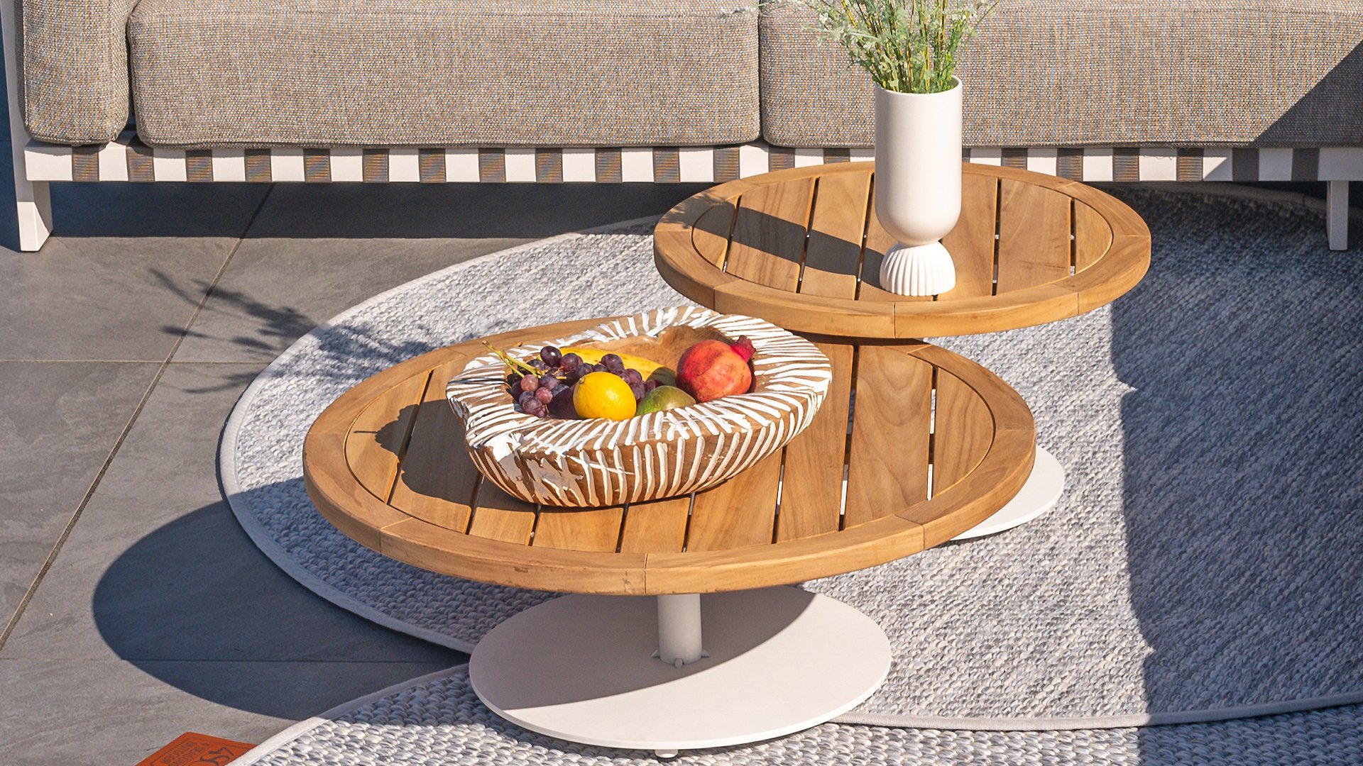 Entdecken Sie die Schönheit und Vielseitigkeit des runden Couchtischs 4 Seasons Outdoor Volta mit seiner wunderschönen Teakholz-Tischplatte und dem Edelstahlrahmen. Die Tischserie Volta besteht aus 3 Größen und 3 Farben Anthrazit, Weiß, Latte. Dieser Tisch verleiht Ihrem Außenbereich einen Hauch natürlicher Eleganz und wurde mit Liebe zum Detail entworfen.