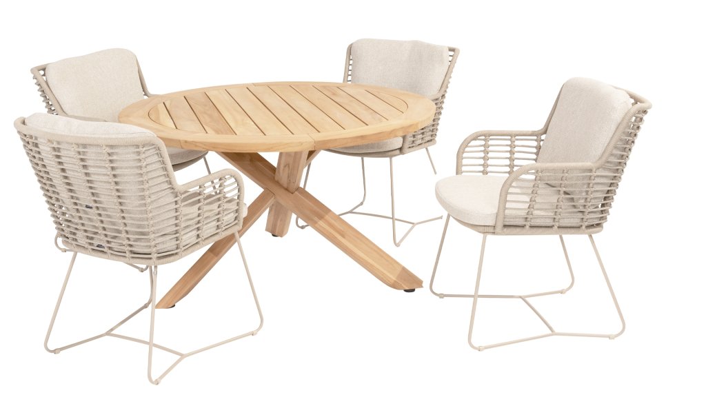 Aus den besten Materialien gefertigt, mit Leidenschaft hergestellt. Diese wunderschöne 4Seasons Fabrice Dining-Serie besticht nicht nur durch Stil, sondern auch durch hervorragenden Sitzkomfort. Der Stuhl ist auch in folgenden Farben erhältlich: Anthrazit, Latte & TerreDie verwendeten Materialien sind Kunststoffseil, Olefin & Aluminium. Kunststoffseil enthält einen Kern, der für Farbechtheit sorgt und es schimmelbeständig macht. Olefin macht die Kissen ebenfalls farbecht und wasserbeständig, der Stoff fühlt sich auch angenehm an. Das Gestell des Fabrice ist pulverbeschichtetes Aluminium, um das moderne Design abzurunden! Auch erhältlich in Lounge: 4SO Fabrice Eck-Loungeset & 4SO Fabrice Loungeset.