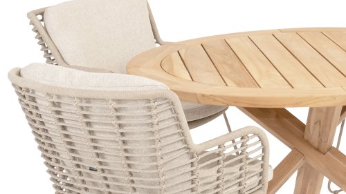 Gartenmöbel aus Teakholz bieten einen atemberaubenden Blick.Teakholz eignet sich besonders gut für den Einsatz im Außenbereich. Es ist resistent gegen Schädlinge und Pilze und widerstandsfähig gegen Sonne, Regen und Schnee. Mit der Zeit entwickelt das Teakholz eine silbergraue Patina. Gartenmöbel aus Teakholz bieten einen atemberaubenden Blick. Darüber hinaus ist es starkes Material und erfordert nur wenig Wartung. Wer die ursprüngliche Farbe des Teakholzes bevorzugt, kann durch regelmäßiges benutzen unser Pflegemittel ganz einfach das Vergrauen des Holzes verhindern.Darüber hinaus können Sie Teak mit grüner Seife reinigen. Durch Temperaturunterschiede und durch den Wechsel von Feuchtigkeit und Trockenheit können kleine Haarrisse entstehen. Es ist üblich, dass Man in dies Unvollkommenheiten findet, diese Unregelmäßigkeiten sind kennzeichnend für dieses Produkt. Diese Unregelmäßigkeiten können nie einen Anlass zu Reklamation, Garantie oder Claim formen. Es betrifft eine Unterschrift von Originalität!  Wir gewähren Garantie auf alle Produktions- und Konstruktionsfehler. Die Wirkung von Teakholz ist nicht enthalten. Wenn Sie sich für Teakholz entscheiden, erwarten wir, dass Sie diese Eigenschaften zu schätzen wissen. Eventuell auftretende Haarrisse, Äste im Teakholz und raue Oberflächen im Laufe der Zeit fallen nicht unter unsere Garantie. Diese Eigenschaften verleihen dem Teakholz seinen eigenen Charakter und sind Teil der Optik. Seien Sie vorsichtig mit einem Blumentopf oder einer Vase auf Ihrem Gartentisch aus Teakholz, da dies zu hartnäckigen Kreisen oder Farbunterschieden führen kann.