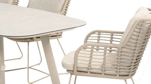 Aus den besten Materialien gefertigt, mit Leidenschaft hergestellt. Diese wunderschöne 4Seasons Fabrice Dining-Serie besticht nicht nur durch Stil, sondern auch durch hervorragenden Sitzkomfort. Der Stuhl ist auch in folgenden Farben erhältlich: Anthrazit, Latte & TerreDie verwendeten Materialien sind Kunststoffseil, Olefin & Aluminium. Kunststoffseil enthält einen Kern, der für Farbechtheit sorgt und es schimmelbeständig macht. Olefin macht die Kissen ebenfalls farbecht und wasserbeständig, der Stoff fühlt sich auch angenehm an. Das Gestell des Fabrice ist pulverbeschichtetes Aluminium, um das moderne Design abzurunden! Auch erhältlich in Lounge: 4SO Fabrice Eck-Loungeset & 4SO Fabrice Loungeset.