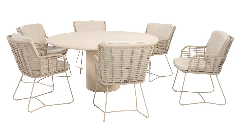 Aus den besten Materialien gefertigt, mit Leidenschaft hergestellt. Diese wunderschöne 4Seasons Fabrice Dining-Serie besticht nicht nur durch Stil, sondern auch durch hervorragenden Sitzkomfort. Der Stuhl ist auch in folgenden Farben erhältlich: Anthrazit, Latte & TerreDie verwendeten Materialien sind Kunststoffseil, Olefin & Aluminium. Kunststoffseil enthält einen Kern, der für Farbechtheit sorgt und es schimmelbeständig macht. Olefin macht die Kissen ebenfalls farbecht und wasserbeständig, der Stoff fühlt sich auch angenehm an. Das Gestell des Fabrice ist pulverbeschichtetes Aluminium, um das moderne Design abzurunden! Auch erhältlich in Lounge: 4SO Fabrice Eck-Loungeset & 4SO Fabrice Loungeset.