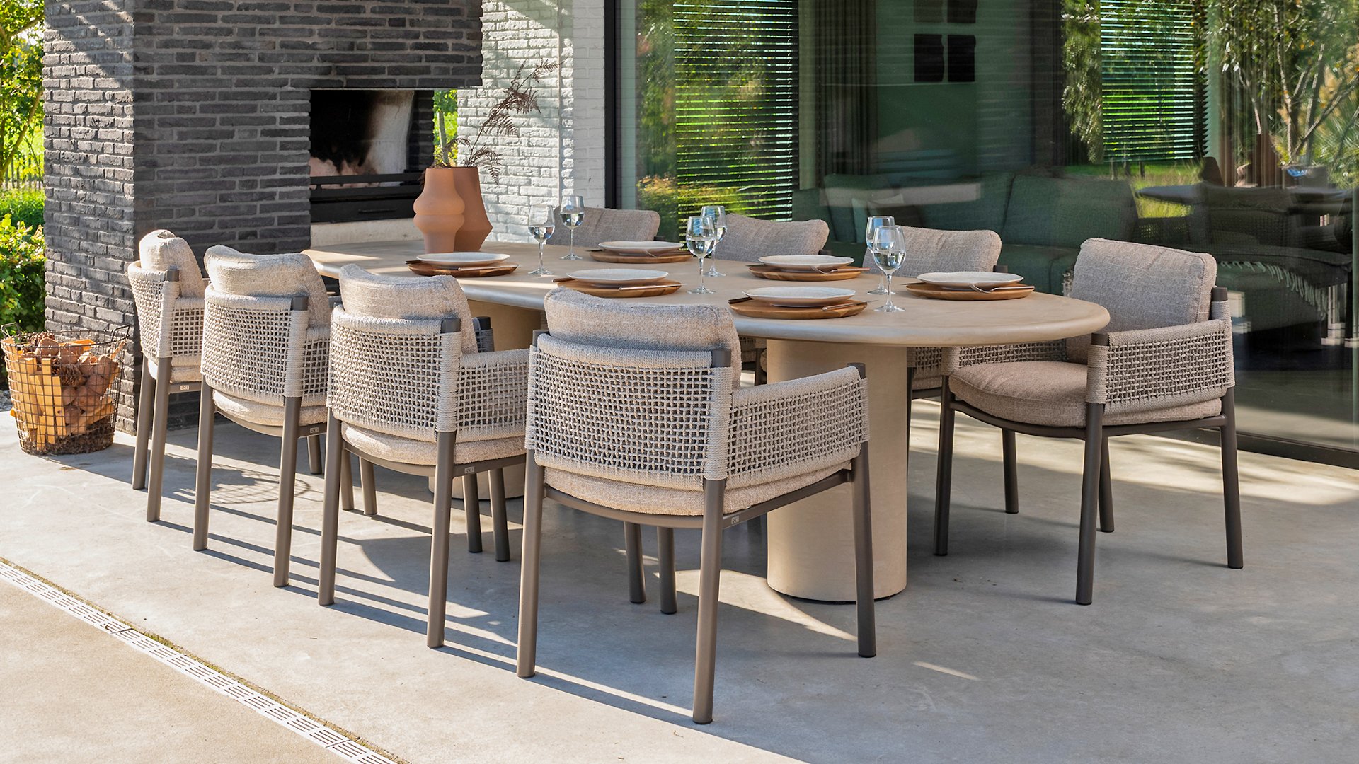 Der Hampton ist aus hochwertigem Mortex gefertigt, einem langlebigen und wasserfesten Material, das für seine natürliche Optik und außergewöhnliche Wetterbeständigkeit bekannt ist. Jede Tischplatte wird von Hand bearbeitet und schafft so einen einzigartigen, warmen Look, der sowohl moderne als auch mediterrane Gärten perfekt ergänzt.