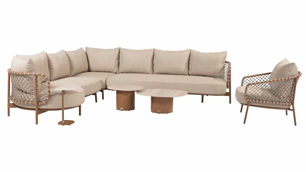 Erleben Sie zeitlosen Luxus mit der Martinique Loungegruppe von 4 Seasons Outdoor. Das auffällige geknotete Rope-Design verleiht einen spielerischen, aber raffinierten Charakter, während der bernsteinfarbene Rahmen Wärme und Ambiente in Ihren Garten oder Ihre Terrasse bringt. Dieses Set ist perfekt für alle, die eine Kombination aus Stil und Komfort suchen.