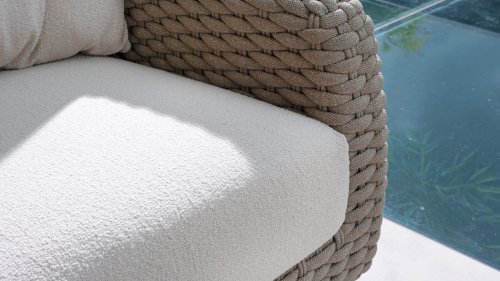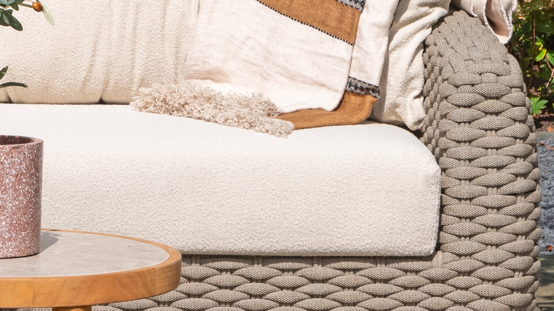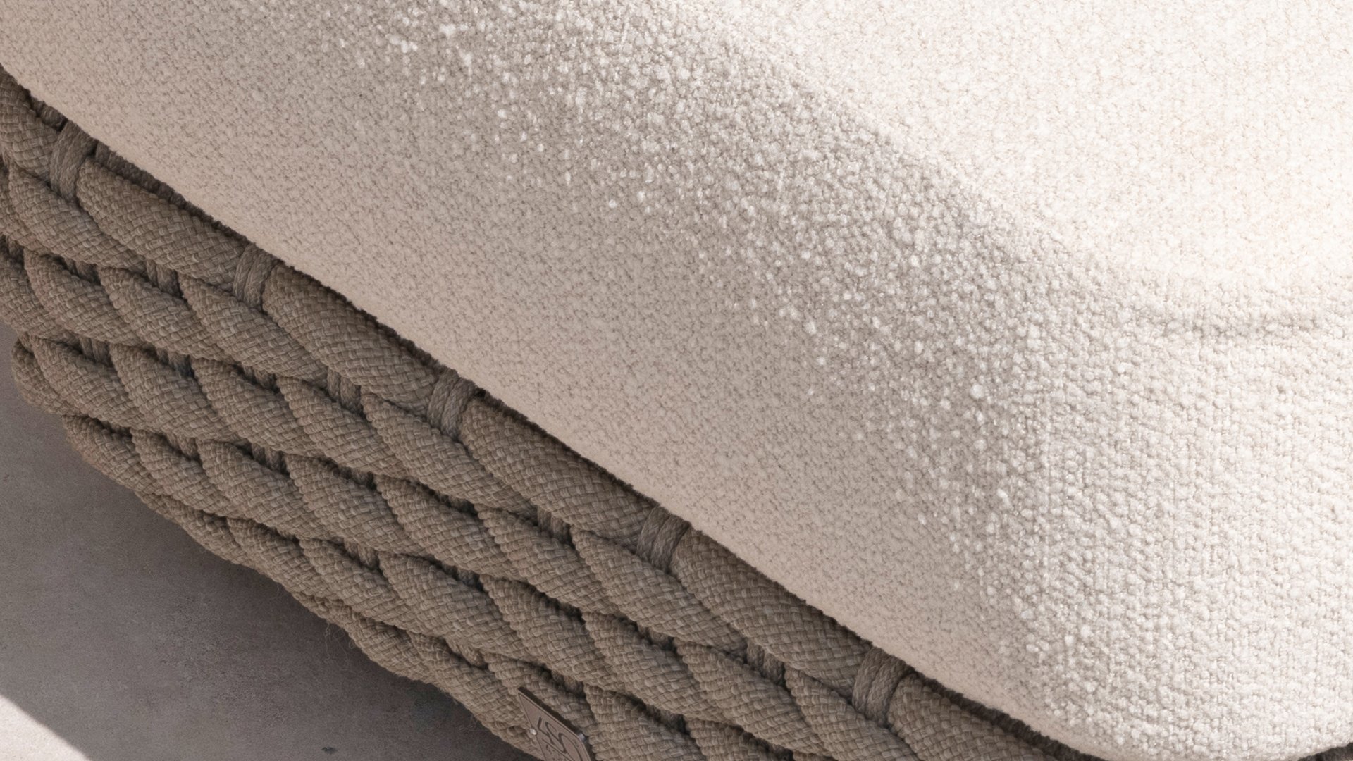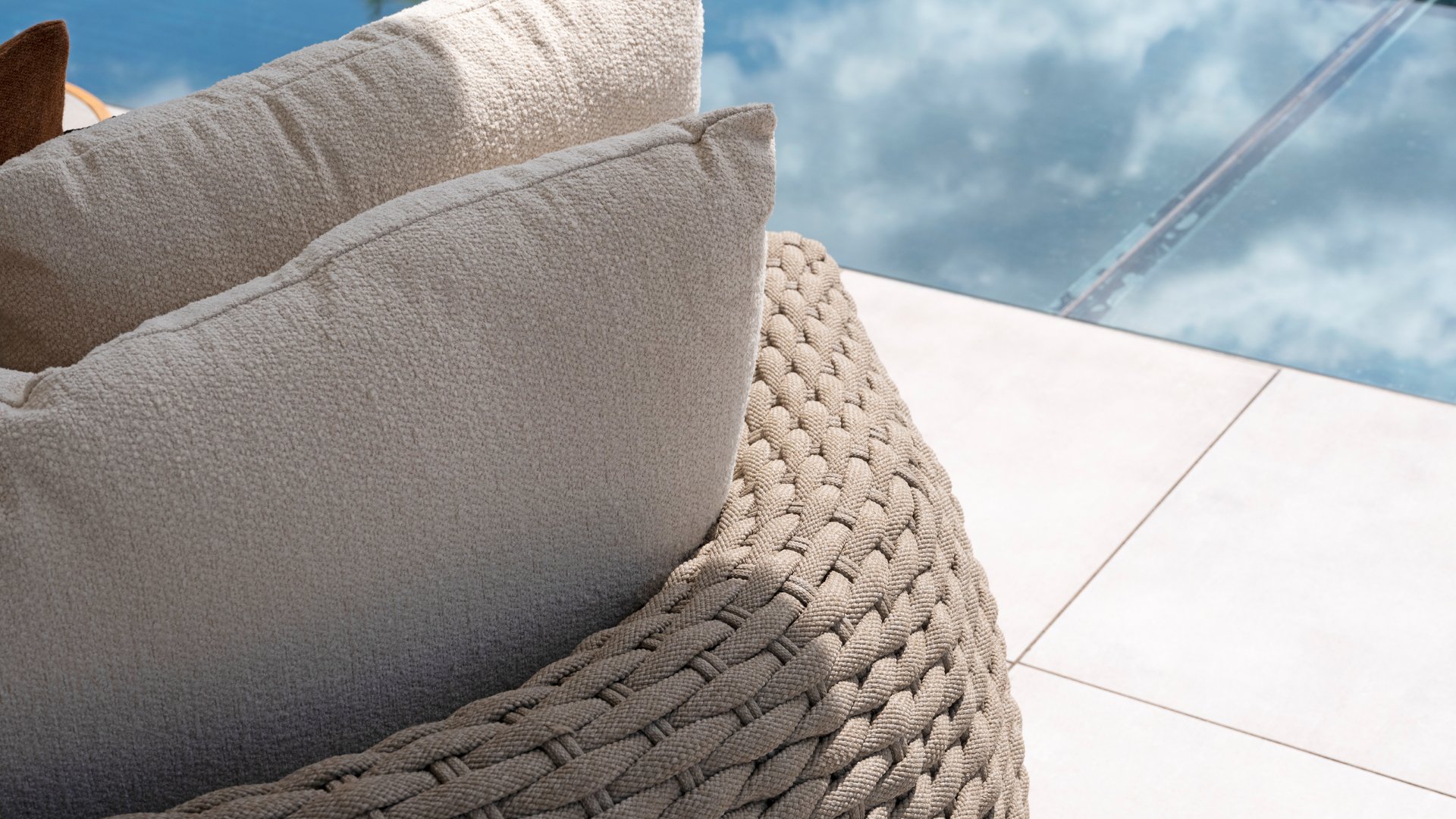 Dieses wunderschöne Material eignet sich perfekt für den Außenbereich, denn Rope ist nicht nur eine normale Spitze, an der Sie Ihre Schuhe binden können. Unsere runden Fäden sind mit einem Kunststoffkern versehen. Diese Basis aus Polypropylen sorgt dafür, dass sich das Rope minimal dehnt und sie nimmt außerdem keine Feuchtigkeit auf. Die Umhüllung besteht aus Acrylstoff, der mit dem wetterfesten Stoff unserer Gartenkissen vergleichbar ist. Diese Umhüllung fühlt sich weich an und ist sehr wasserabweisend, UV-beständig und farbecht. Die flachen Rope-Varianten besitzen den gleichen wetterfesten Materialmix, doch das Polypropylen-Material wurde hier mit dem Acryl-Stoff verwebt. Durch diese Technik besitzt das flache Rope die gleichen Eigenschaften, hat jedoch eine ganz andere Ausstrahlung.