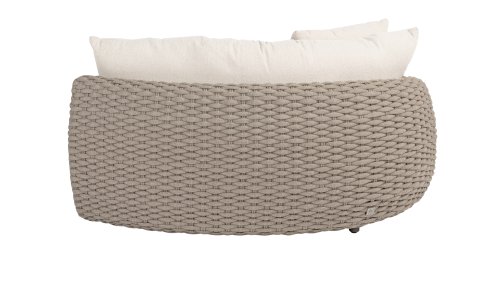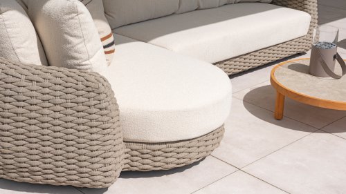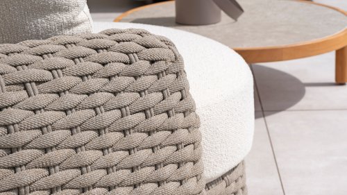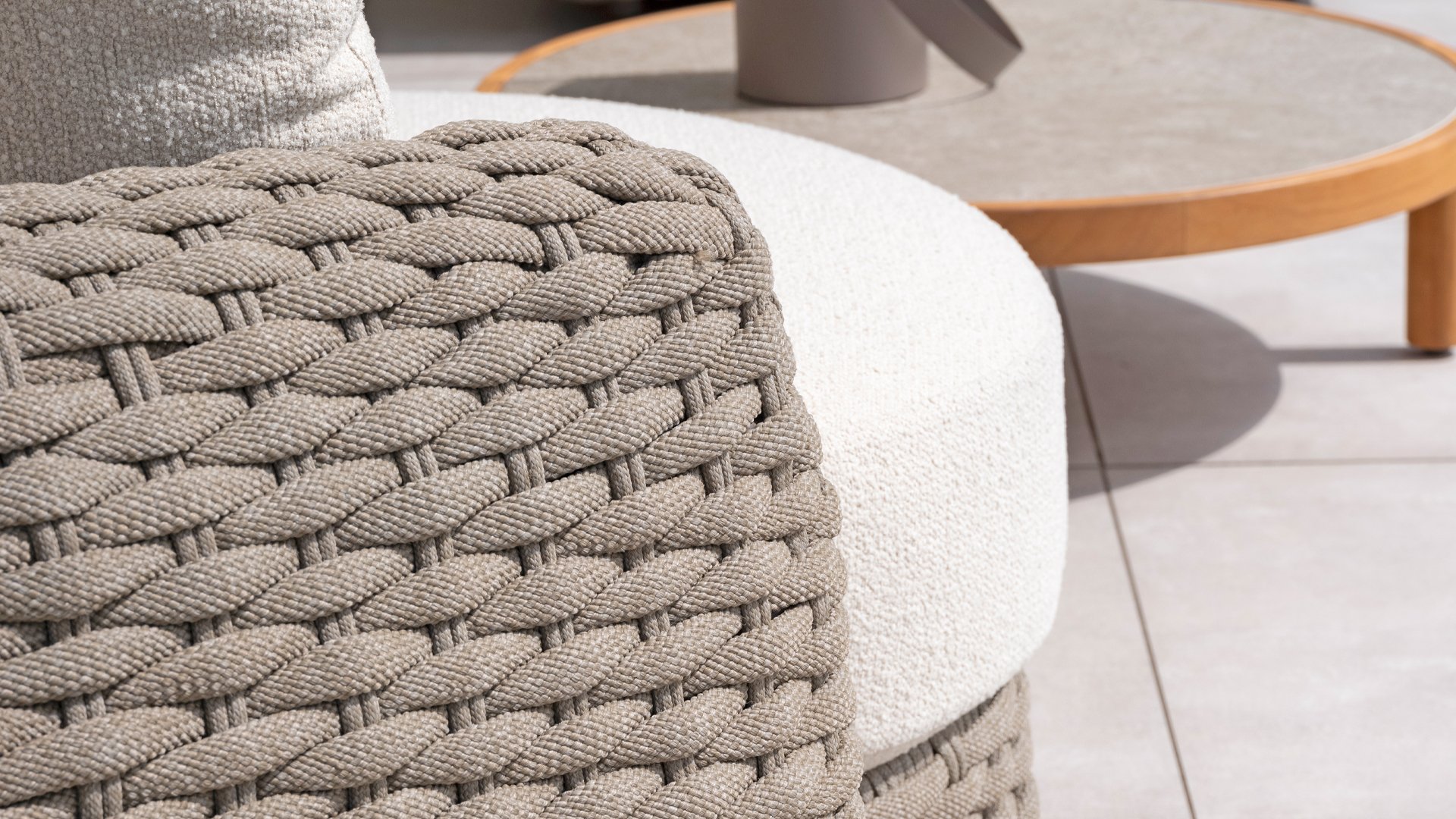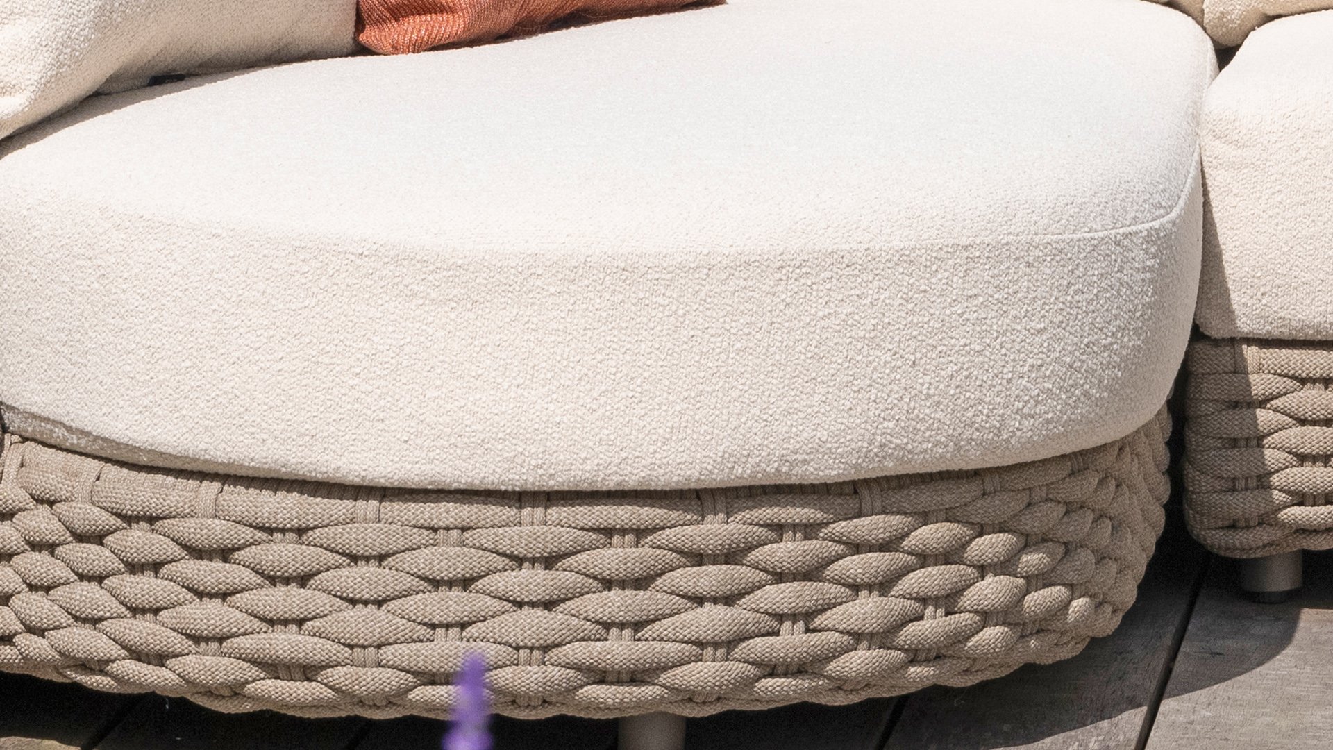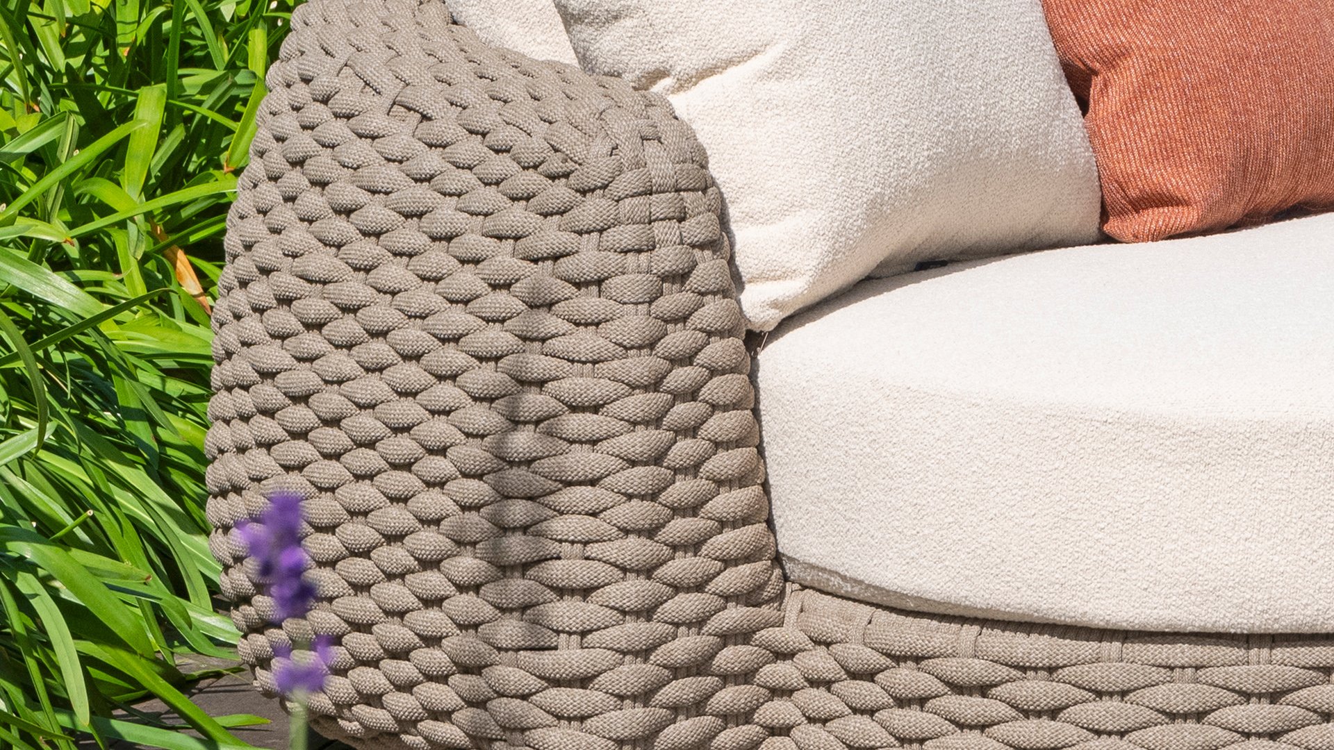 Dieses wunderschöne Material eignet sich perfekt für den Außenbereich, denn Rope ist nicht nur eine normale Spitze, an der Sie Ihre Schuhe binden können. Unsere runden Fäden sind mit einem Kunststoffkern versehen. Diese Basis aus Polypropylen sorgt dafür, dass sich das Rope minimal dehnt und sie nimmt außerdem keine Feuchtigkeit auf. Die Umhüllung besteht aus Acrylstoff, der mit dem wetterfesten Stoff unserer Gartenkissen vergleichbar ist. Diese Umhüllung fühlt sich weich an und ist sehr wasserabweisend, UV-beständig und farbecht. Die flachen Rope-Varianten besitzen den gleichen wetterfesten Materialmix, doch das Polypropylen-Material wurde hier mit dem Acryl-Stoff verwebt. Durch diese Technik besitzt das flache Rope die gleichen Eigenschaften, hat jedoch eine ganz andere Ausstrahlung.
