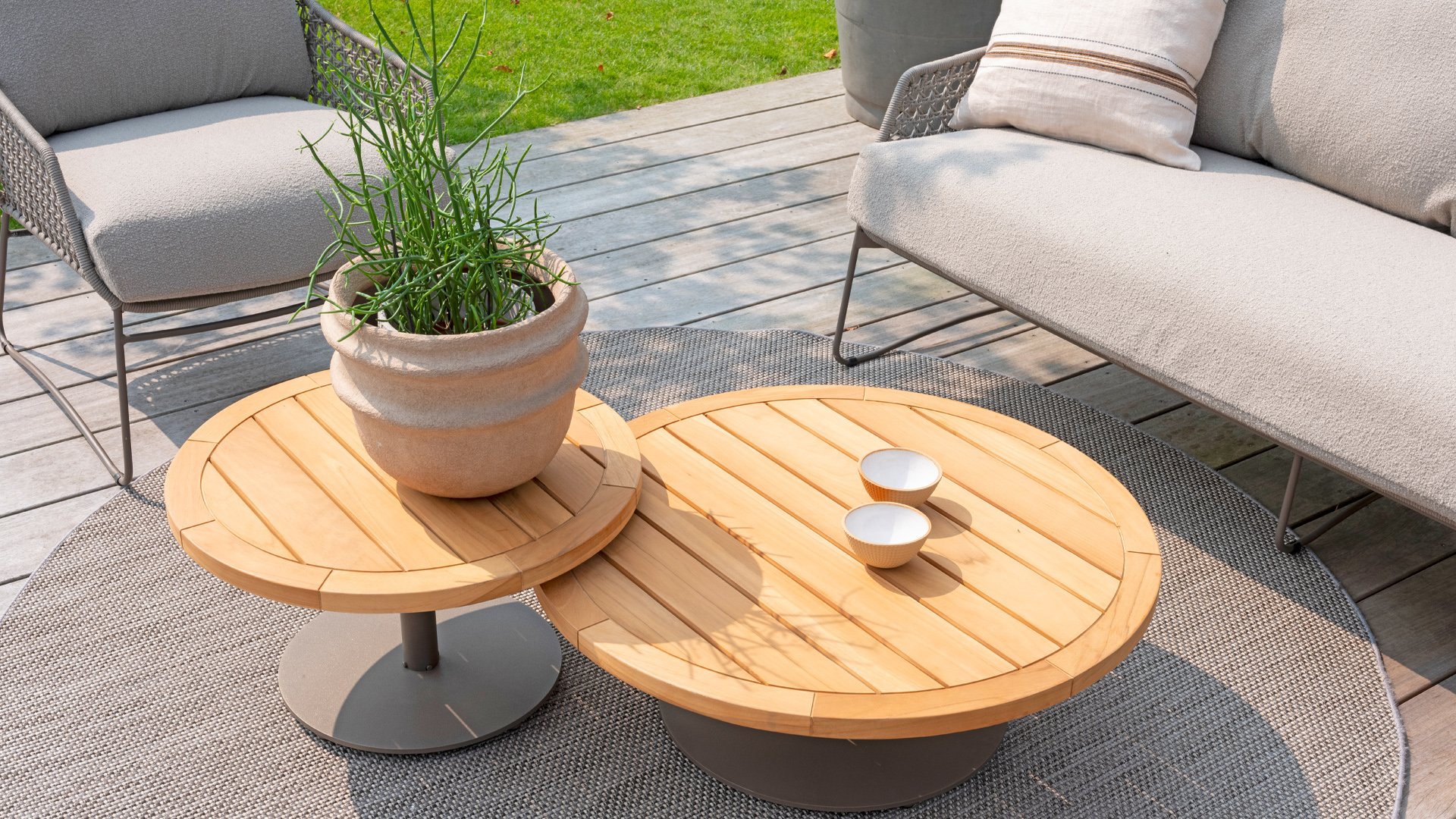 Entdecken Sie die Schönheit und Vielseitigkeit des runden Couchtischs 4 Seasons Outdoor Volta mit seiner wunderschönen Teakholz-Tischplatte und dem Edelstahlrahmen. Dieser Tisch verleiht Ihrem Außenbereich einen Hauch natürlicher Eleganz und wurde mit Liebe zum Detail entworfen. Charakteristisch ist das zentrale Bein und die robuste Bodenplatte, die diesen Tisch äußerst stabil machen. Da es den Couchtisch Volta in verschiedenen Größen und Farben gibt, können Sie ihn nach Herzenslust kombinieren.