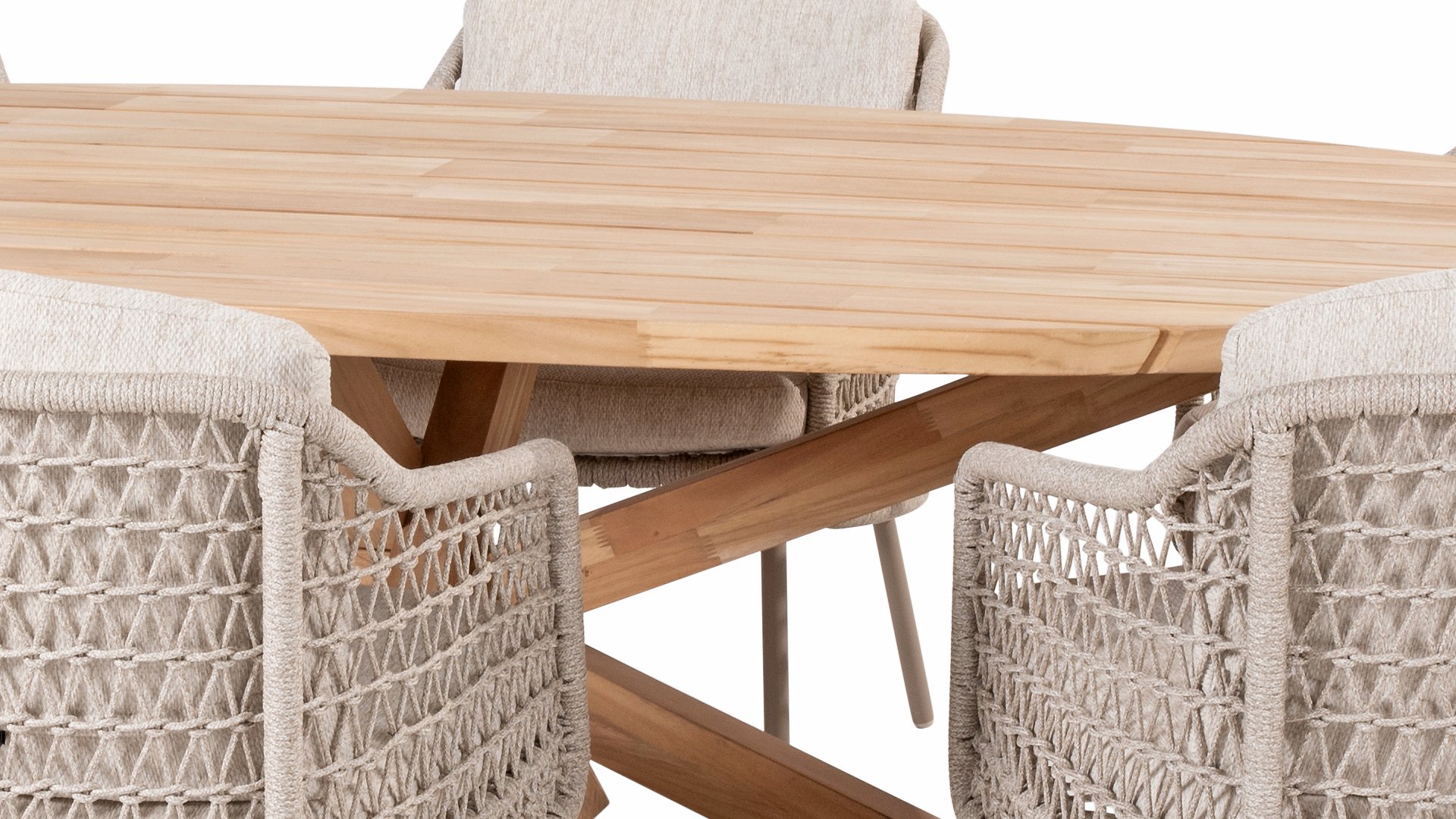 Die Taste by 4Seasons Prado Ellips kann ruhig als Kunstwerk bezeichnet werden. Schau mal, wie kunstvoll dieses Bein-Design ist. Die dicke Teakholzplatte ist schräg und verleiht dem Tisch etwas Luftiges. Kombinierbar mit unserer gesamten Kollektion von Gartensesseln. Auch mit Gestell in Anthrazit, Teak, Latte oder Terre erhältlich: