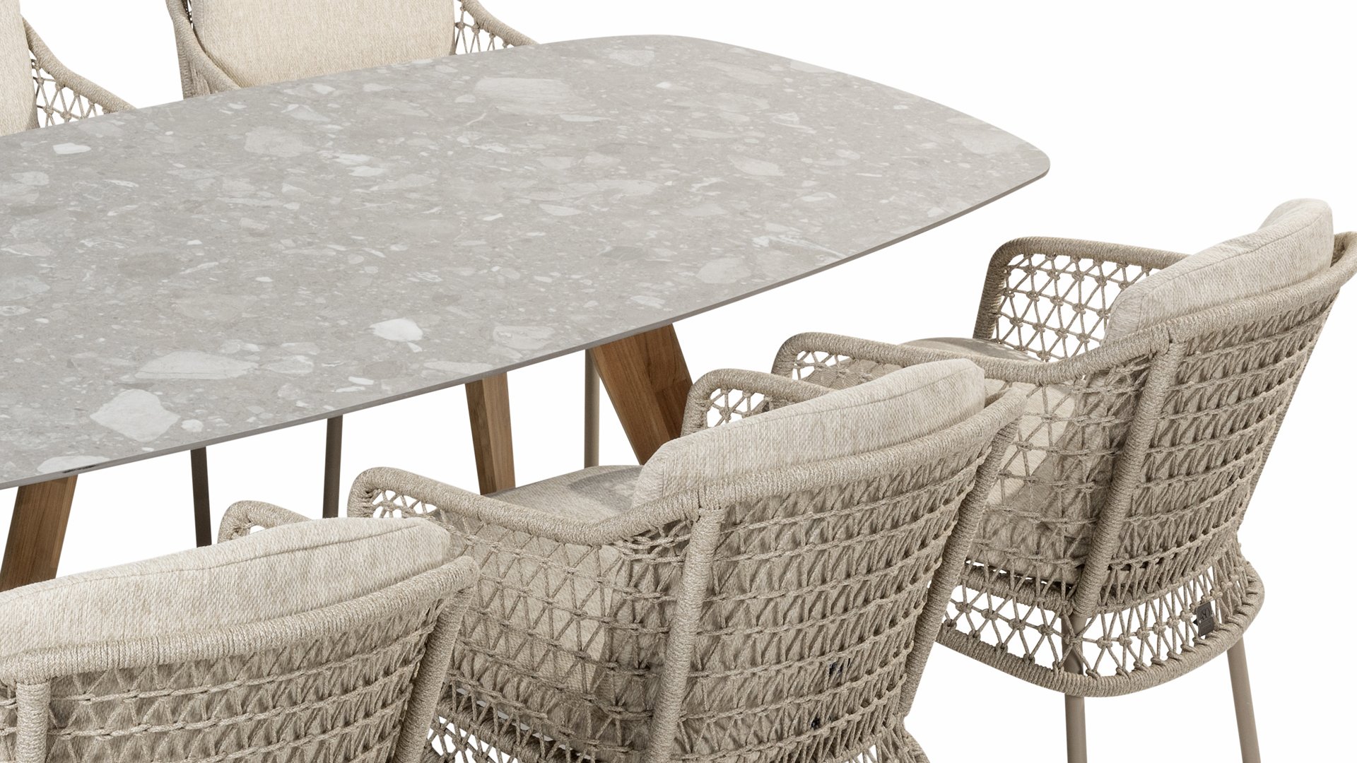 Der 4Seasons Outdoor Montana ist ein wunderschöner Tisch, der sofort ins Auge fällt. Es sieht nicht nur modern aus, sondern ist durch die Form der Tischplatte auch äußerst praktisch. Der Tisch zeichnet sich durch seine dänisch-ovale Tischplatte aus, die Form schafft ausreichend Platz auf allen Seiten des Tisches. Bei der Montana-Serie gibt es mehrere Optionen; Die 240 cm hohe Terrazzo-Keramikplatte kann mit einem Untergestell aus Edelstahl oder Teakholz kombiniert werden. Innerhalb der Montana-Serie gibt es auch einen 280 cm großen Tisch mit HPL-Platte.
