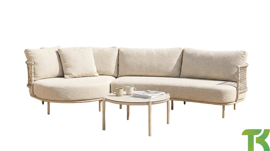 Natürliche Ausstattung: Der Latte-Seil-Bezug wird auf dem Sofa in einer natürlichen, warmen und Outdoor-Ausstattung platziert, perfekt für eine angenehme Entspannung.