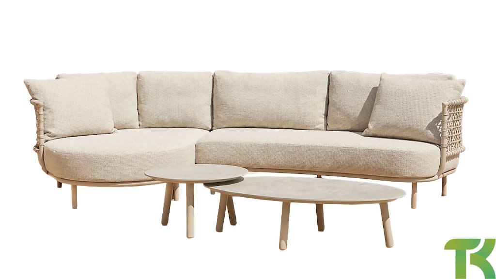 Natürliche Ausstattung: Der Latte-Seil-Bezug wird auf dem Sofa in einer natürlichen, warmen und Outdoor-Ausstattung platziert, perfekt für eine angenehme Entspannung.