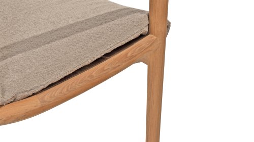 Das Kissen des Stuhls ist aus Olefin gefertigt und in Bouclé-Optik für mehr Eleganz gewebt. Das taupefarbene Kissen fügt einen beruhigenden, neutralen Farbton hinzu, der gut zum natürlichen Aussehen des Teakholzrahmens passt. Das Kissen ist an 4 Punkten am Teakholzrahmen festgemacht.