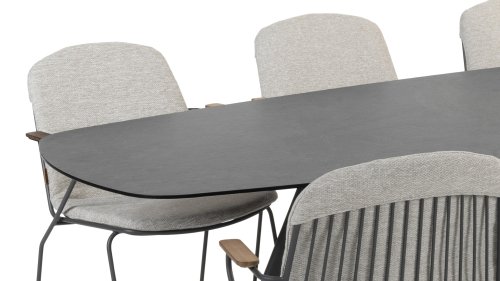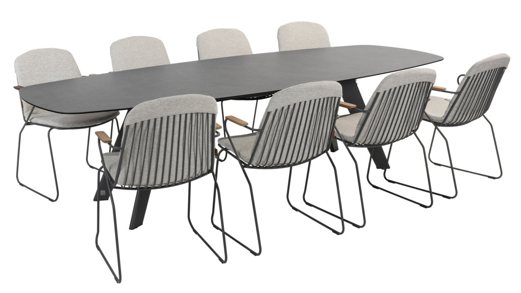 Der 4Seasons Outdoor Montana ist ein wunderschöner Tisch, der sofort ins Auge fällt. Es sieht nicht nur modern aus, sondern ist durch die Form der Tischplatte auch äußerst praktisch. Der Tisch zeichnet sich durch seine dänisch-ovale Tischplatte aus, die Form schafft ausreichend Platz auf allen Seiten des Tisches. Bei der Montana-Serie gibt es mehrere Optionen; Die 240 cm hohe Terrazzo-Keramikplatte kann mit einem Untergestell aus Edelstahl oder Teakholz kombiniert werden. Innerhalb der Montana-Serie gibt es auch einen 280 cm großen Tisch mit HPL-Platte.