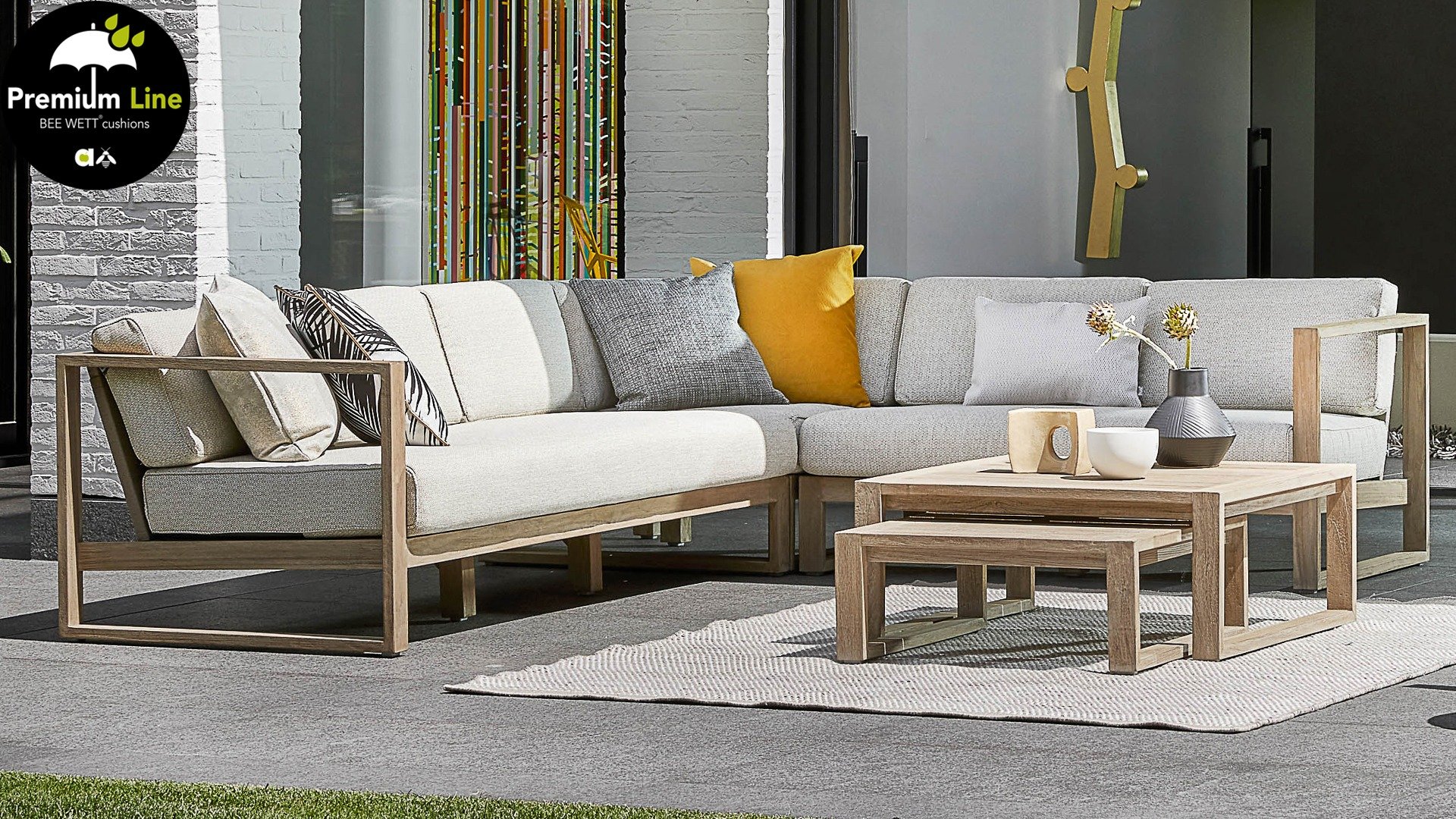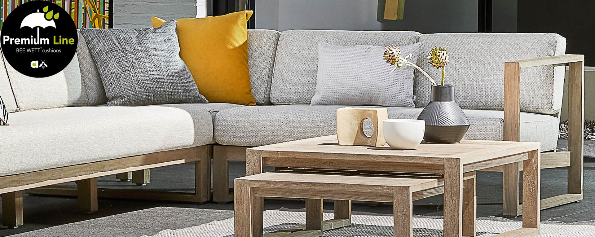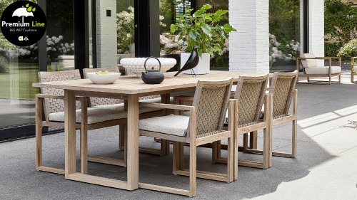 Das wunderschöne Design des Apple Bee Antigua Loungeset basiert sich hauptsächlich auf eckigen, kubistischen Formen, was diesem Set einen so schönen, schlanken Charakter verleiht. Sowohl das Loungeset als auch der Tisch bestehen aus Teakholz mit coastal finish, was ihm ein leichtes Aussehen verleiht. Der Sitz und die Rückenlehne bestehen aus Korbwaren aus 'Gürtel und Seil' in der Farbe Taupe. Und natürlich gibt es für den Sitzkomfort und zur Vervollständigung des Sets dicke Kissen mit unserer eigenen BEE WETT®-Technologie.