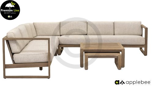 Das Design des Apple Bee Antigua Lounge basiert hauptsächlich auf eckigen, kubistischen Formen, die dieser Loungeset ihr schönes, schlankes Aussehen verleihen. Sowohl die Stühle als auch der Tisch bestehen aus Teakholz mit einem Küsten-Finish, wodurch es eine leichte Ausstrahlung hat. Die Sitz- und Rückenlehne der Loungeset bestehen aus Taupe gefärbtem Flechtwerk von 'Belt und Rope'.