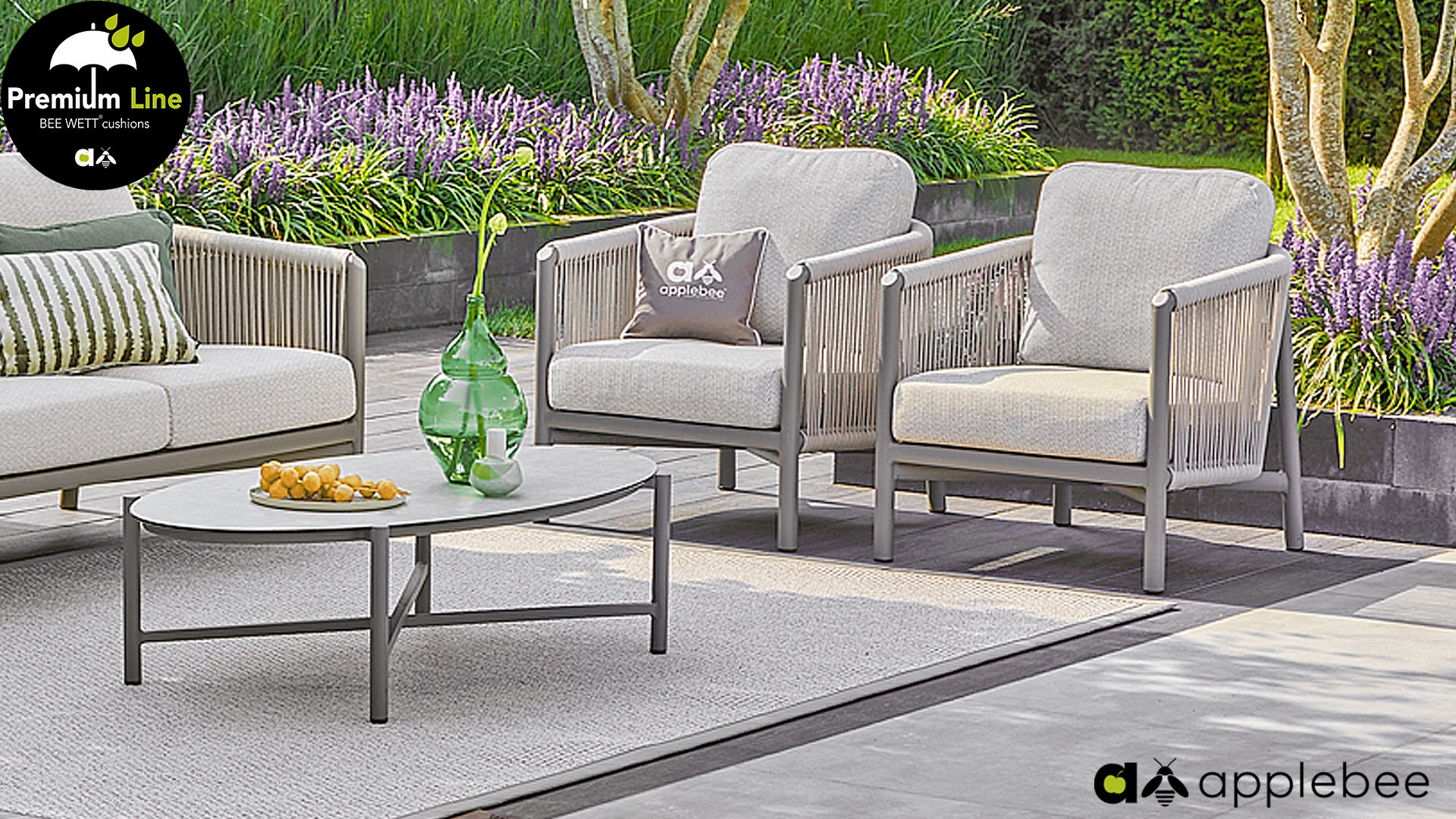 Die Apple Bee Bora Bora Lounge Kollektion ist minimalistisch, elegant und sauber. Sie zeichnet sich durch das zweischichtige geflochtene Seil aus, durch das man hindurchsehen kann. Die feinen, gebogenen Formen dieses Möbels sorgen für ein klares, aber dennoch elegantes Erscheinungsbild. In Kombination mit dem harmonischen Zusammenspiel der Taupe-Farben und des Seils ist das luxuriöse Bora Bora eine wunderschöne Ergänzung im Garten. Natürlich ist dieses Lounge-Set auch wieder mit den Bee Wett®-Kissen ausgestattet. Diese Bee Wett®-Kissen sind spezielle wetterfeste Kissen. Das offene Gewebe an der Unterseite des Kissens sorgt für eine perfekte Drainage. Dadurch trocknet Ihr Bee Wett-Kissen spektakulär viel schneller als andere Kissen. Darüber hinaus ist der Stoff beständig gegen Fäulnis und Schimmel, UV-beständig, feuchtigkeitsbeständig, weich und komfortabel.