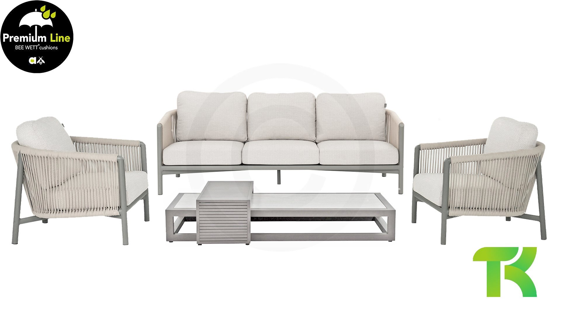Die Apple Bee Bora Bora Lounge Kollektion ist minimalistisch, elegant und sauber. Sie zeichnet sich durch das zweischichtige geflochtene Seil aus, durch das man hindurchsehen kann. Die feinen, gebogenen Formen dieses Möbels sorgen für ein klares, aber dennoch elegantes Erscheinungsbild. In Kombination mit dem harmonischen Zusammenspiel der Taupe-Farben und des Seils ist das luxuriöse Bora Bora eine wunderschöne Ergänzung im Garten. Natürlich ist dieses Lounge-Set auch wieder mit den Bee Wett®-Kissen ausgestattet. Diese Bee Wett®-Kissen sind spezielle wetterfeste Kissen. Das offene Gewebe an der Unterseite des Kissens sorgt für eine perfekte Drainage. Dadurch trocknet Ihr Bee Wett-Kissen spektakulär viel schneller als andere Kissen. Darüber hinaus ist der Stoff beständig gegen Fäulnis und Schimmel, UV-beständig, feuchtigkeitsbeständig, weich und komfortabel.