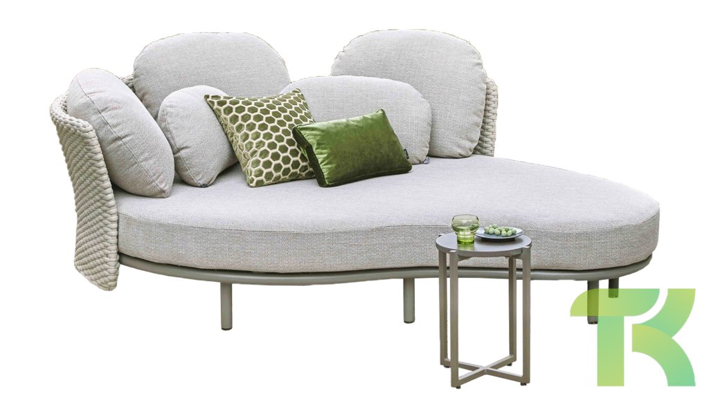 Das Daybed ist in zwei Farben erhältlich: Taupe und Oyster, beides neutrale Töne, die sich leicht mit verschiedenen Gartenstilen und -farben kombinieren lassen. Die Rückenteile sind mit Seilgewebe-Paneelen versehen, einem Material, das sowohl langlebig als auch atmungsaktiv ist. Die Kissen des Chill Out Daybeds haben die Farbe Smoked Grey, einen subtilen, hellgrauen Ton, der eine luxuriöse und raffinierte Atmosphäre ausstrahlt. Die Kissen bestehen aus Olefin, einem Material, das für seine ausgezeichnete Widerstandsfähigkeit gegen Witterungseinflüsse sowie seinen hohen Komfort und seine Langlebigkeit bekannt ist, ideal für den Außenbereich.