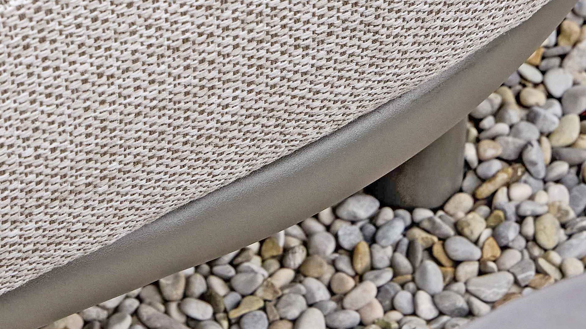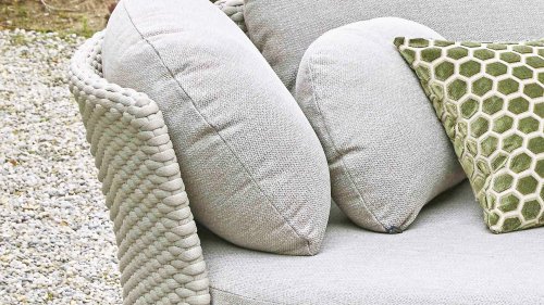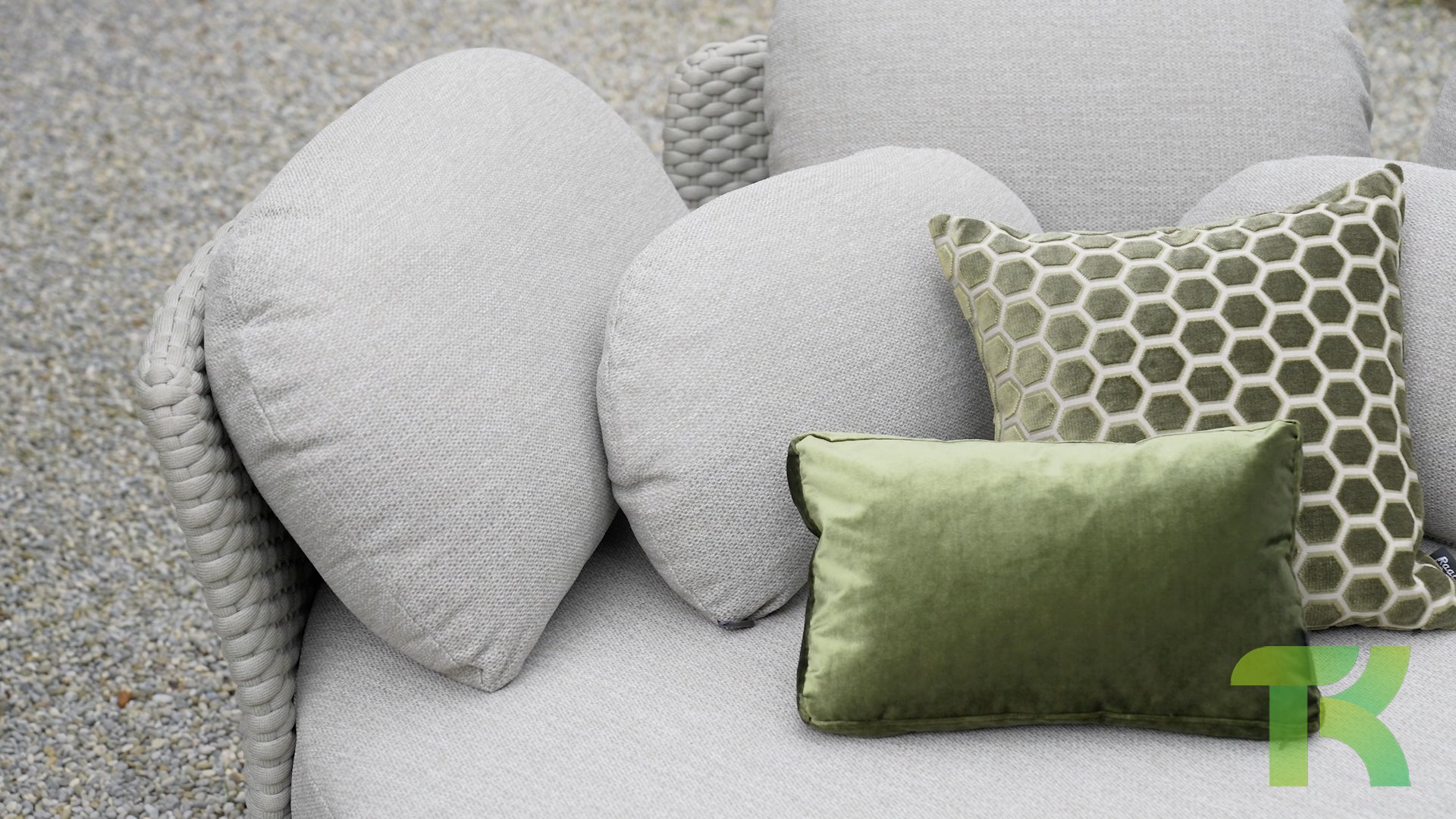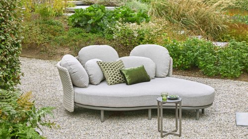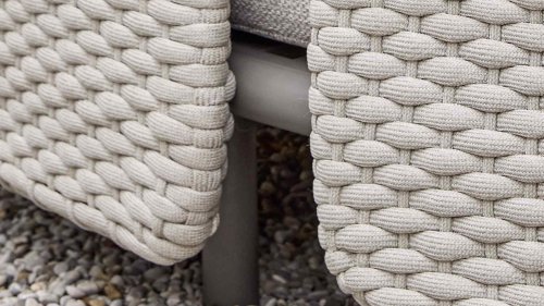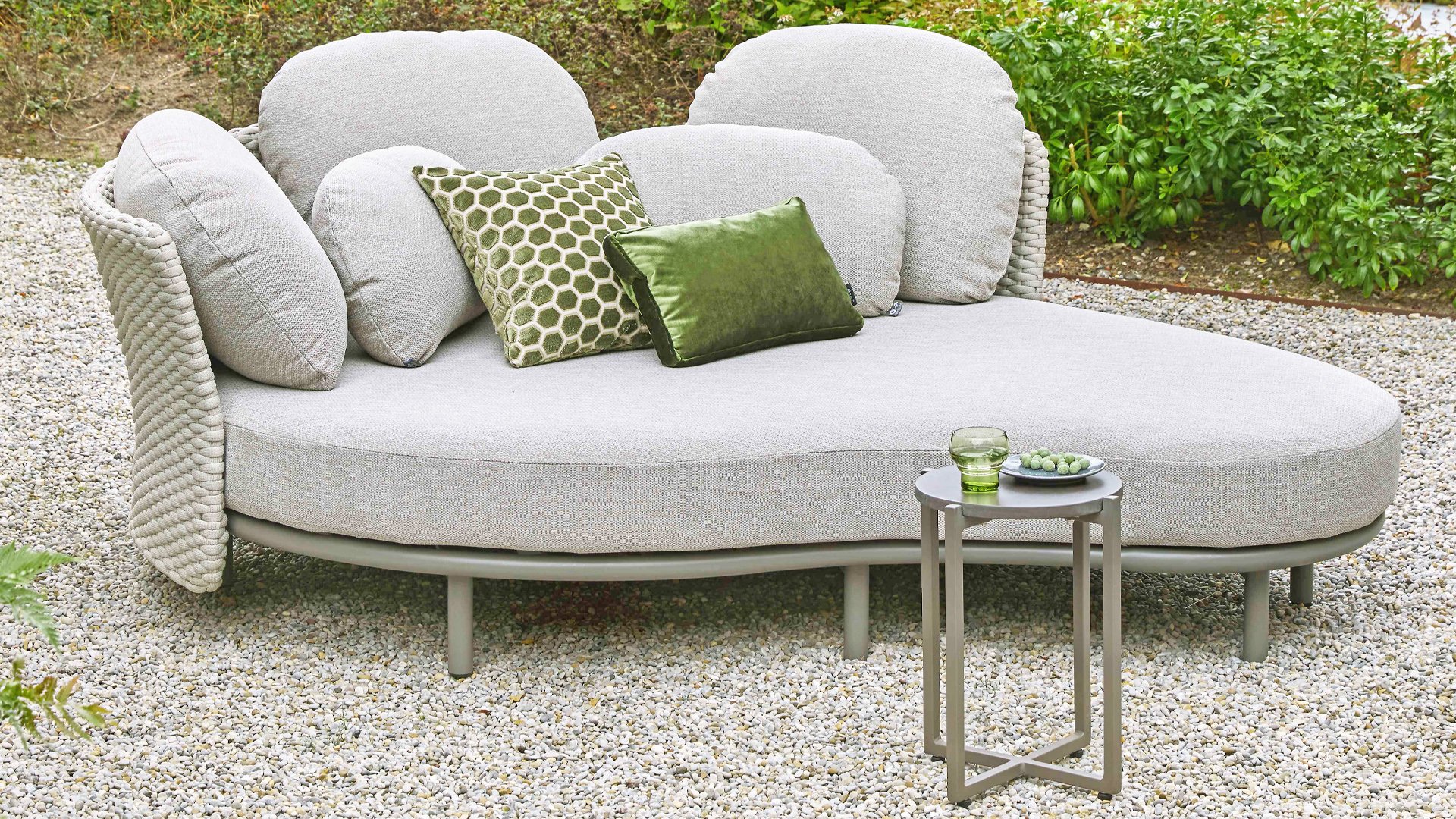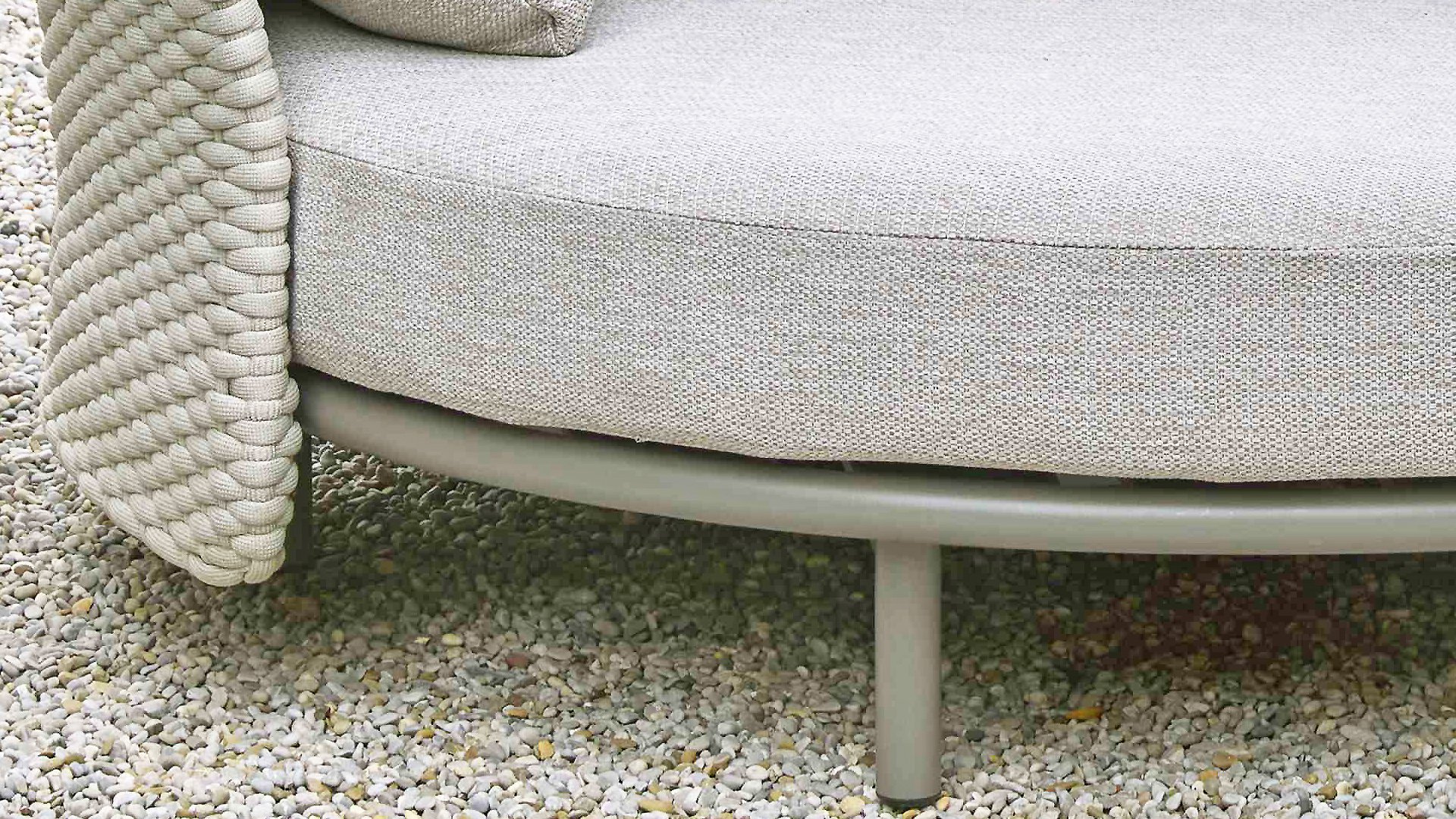 Das Daybed ist in zwei Farben erhältlich: Taupe und Oyster, beides neutrale Töne, die sich leicht mit verschiedenen Gartenstilen und -farben kombinieren lassen. Die Rückenteile sind mit Seilgewebe-Paneelen versehen, einem Material, das sowohl langlebig als auch atmungsaktiv ist. Die Kissen des Chill Out Daybeds haben die Farbe Smoked Grey, einen subtilen, hellgrauen Ton, der eine luxuriöse und raffinierte Atmosphäre ausstrahlt. Die Kissen bestehen aus Olefin, einem Material, das für seine ausgezeichnete Widerstandsfähigkeit gegen Witterungseinflüsse sowie seinen hohen Komfort und seine Langlebigkeit bekannt ist, ideal für den Außenbereich.
