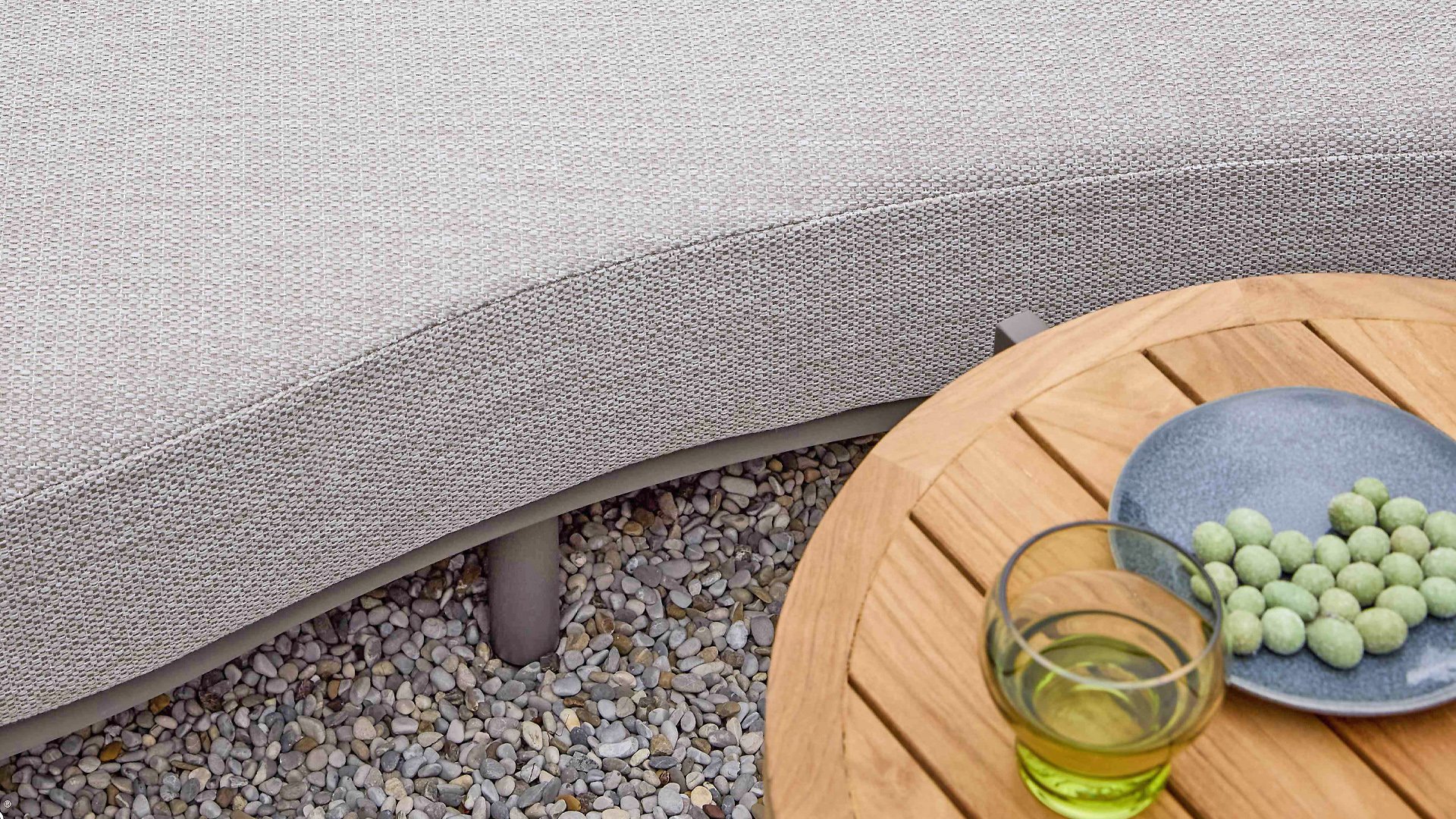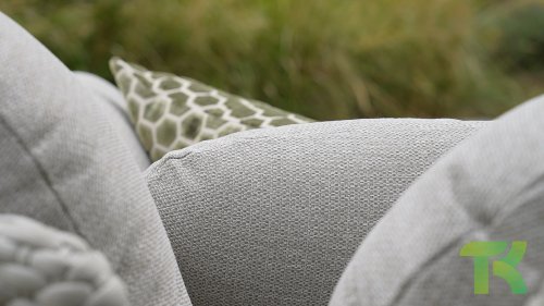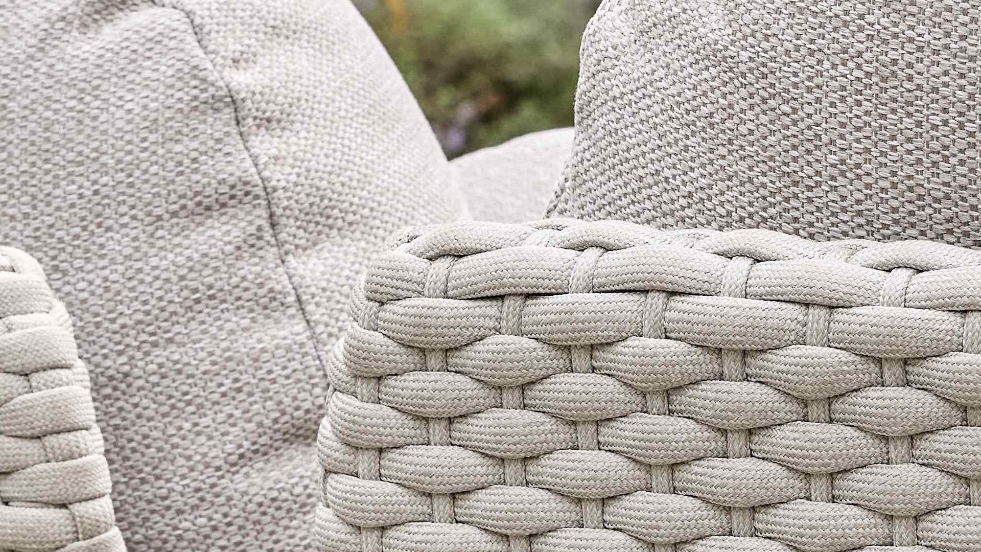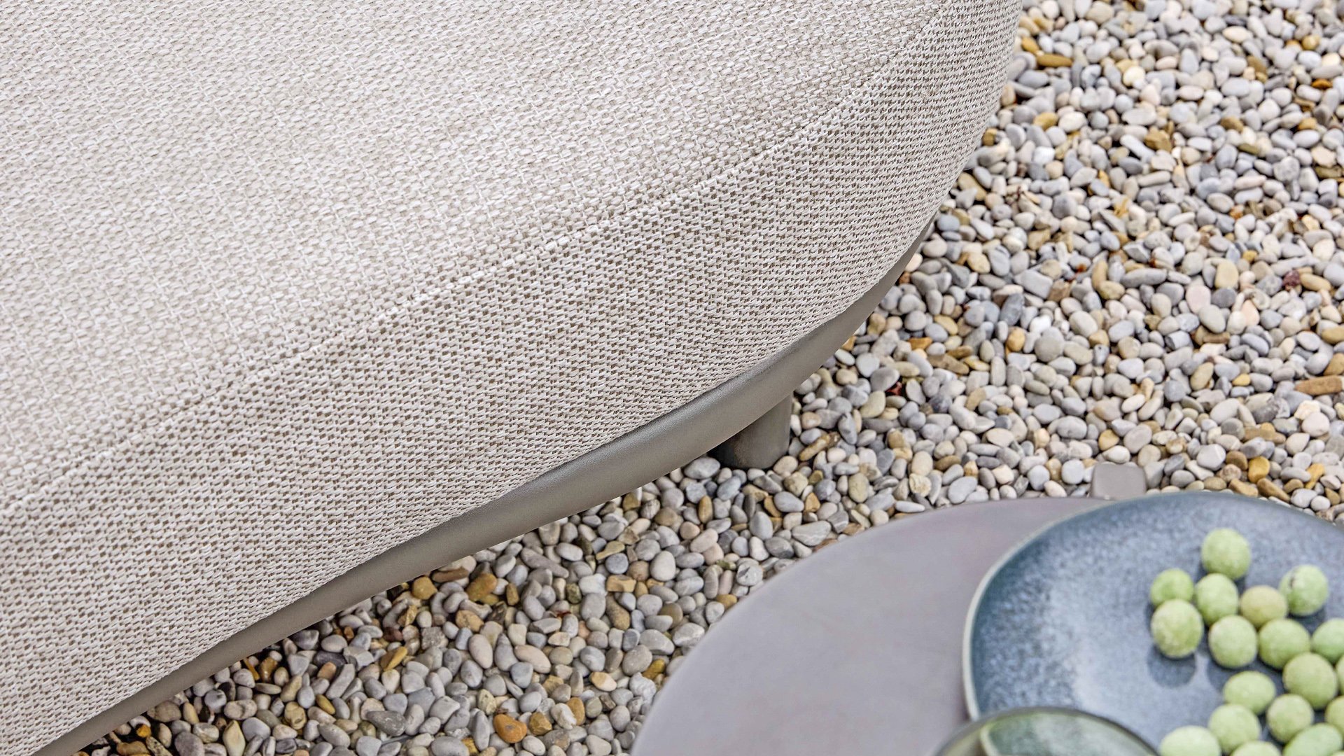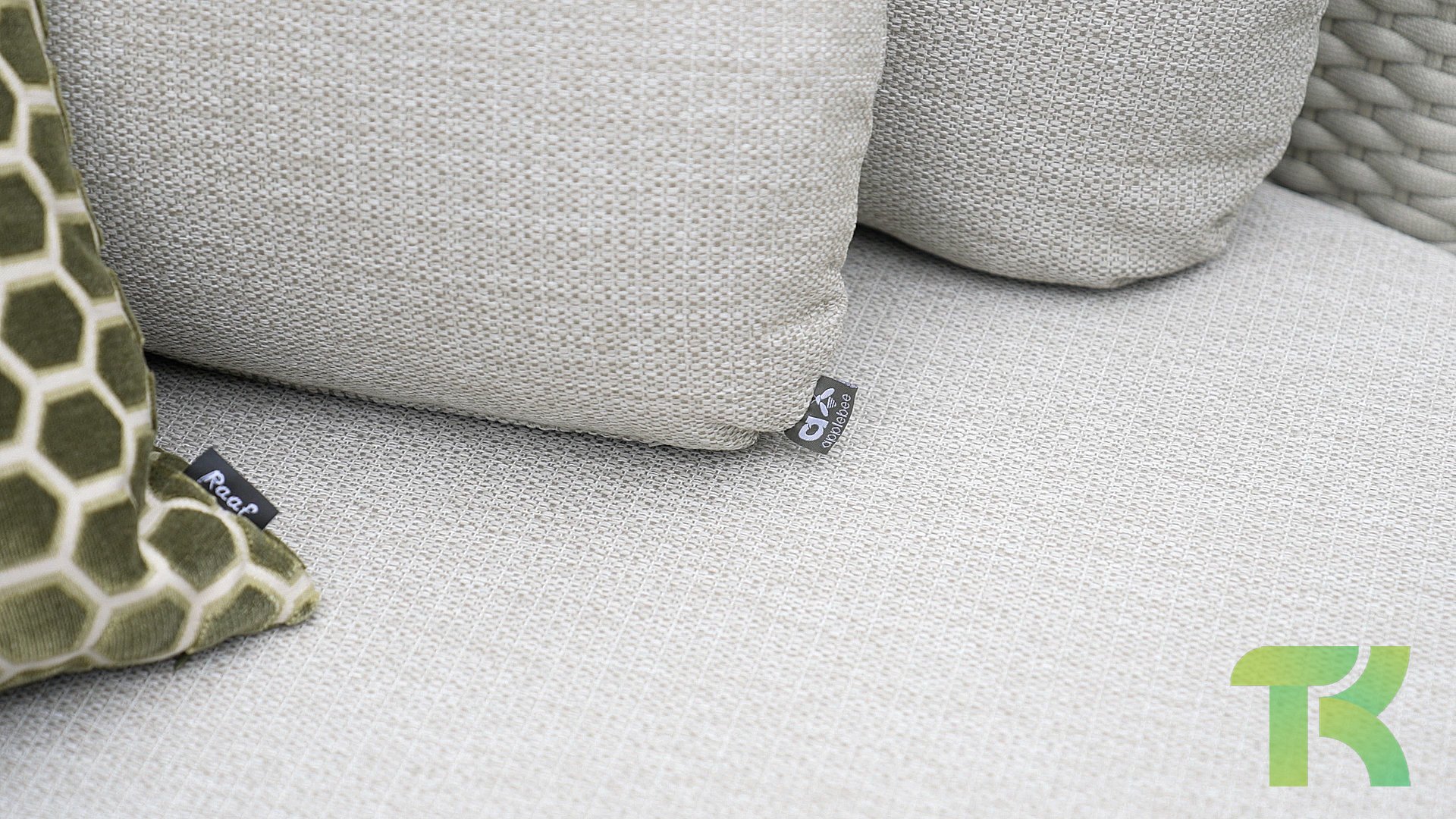 Das Daybed ist in zwei Farben erhältlich: Taupe und Oyster, beides neutrale Töne, die sich leicht mit verschiedenen Gartenstilen und -farben kombinieren lassen. Die Rückenteile sind mit Seilgewebe-Paneelen versehen, einem Material, das sowohl langlebig als auch atmungsaktiv ist. Die Kissen des Chill Out Daybeds haben die Farbe Smoked Grey, einen subtilen, hellgrauen Ton, der eine luxuriöse und raffinierte Atmosphäre ausstrahlt. Die Kissen bestehen aus Olefin, einem Material, das für seine ausgezeichnete Widerstandsfähigkeit gegen Witterungseinflüsse sowie seinen hohen Komfort und seine Langlebigkeit bekannt ist, ideal für den Außenbereich.