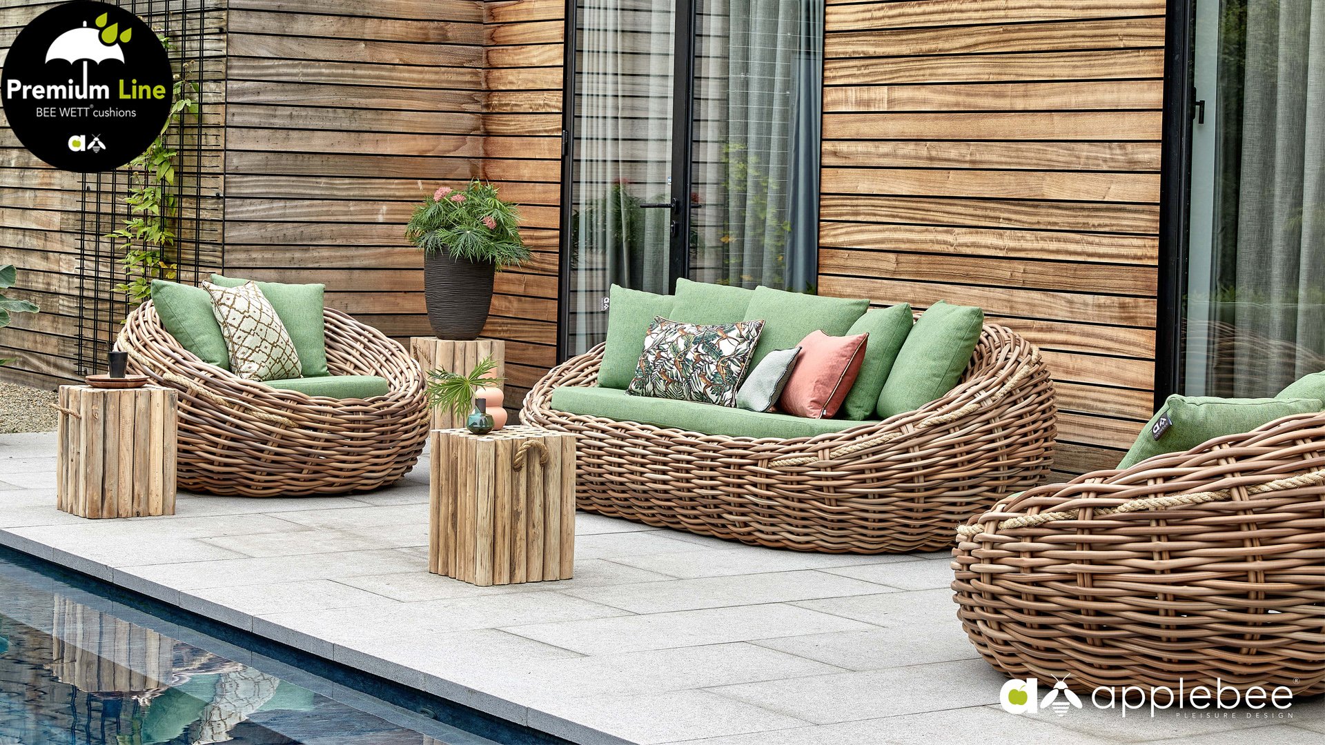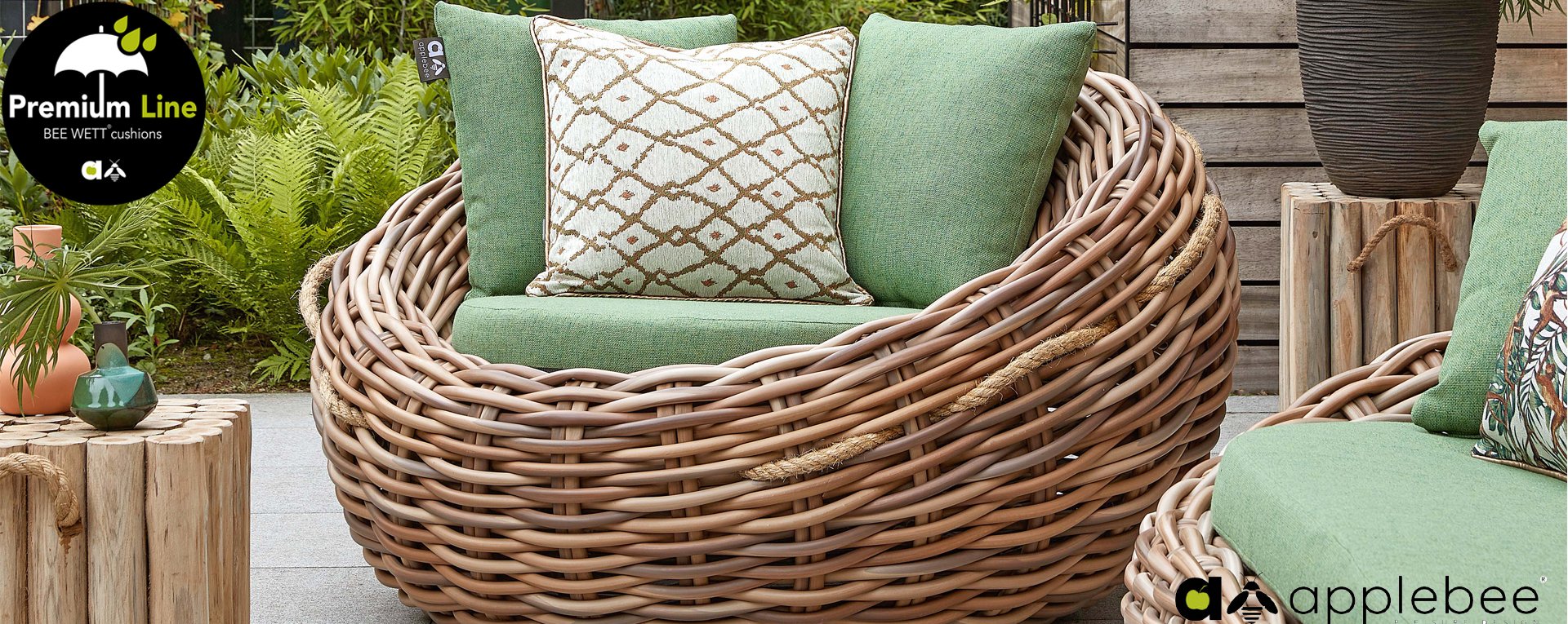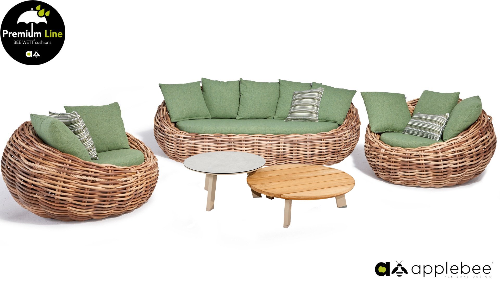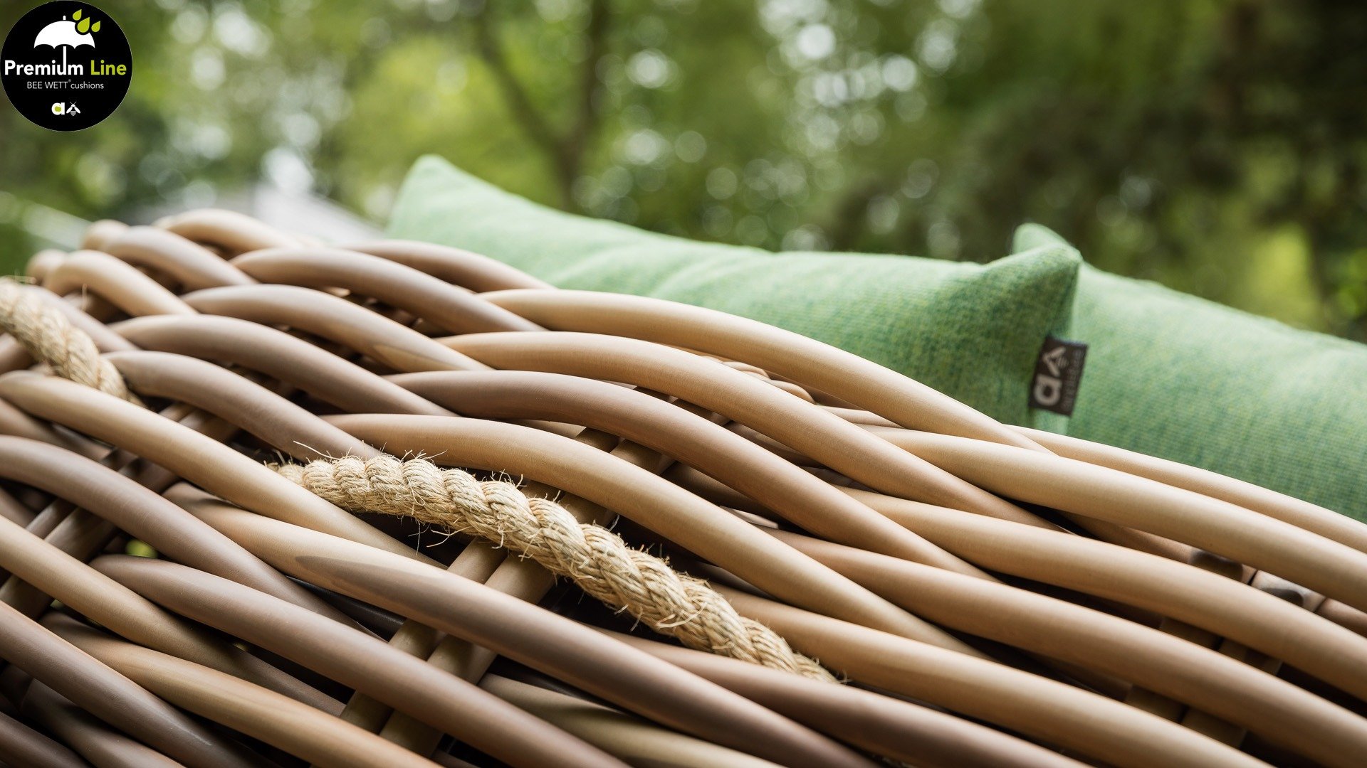 Das Comeback! Nicht umsonst wurde der Apple Bee Cocoon Loungegruppe wieder in die Kollektion von Apple Bee aufgenommen, und diesmal in einem hochmodernen Look. Er ist noch immer inspiriert durch den sicheren Kokon, in dem sich eine Raupe geborgen fühlt und sich in einen wunderschönen Schmetterling verwandelt. Wunderschöne grüne Loungekissen mit Bee-Wett®-Technologie in Kombination mit dem außergewöhnlich dicken geflochtenen Biculair®-Flechtfaden in 20mm Stärke. Immer noch in der typischen runden Form, die Sako Wijma beim ersten Cocoon-Design so schön umzusetzen wusste. Ihr eigenes, geborgenes Fleckchen im Garten oder auf der Terrasse.