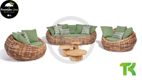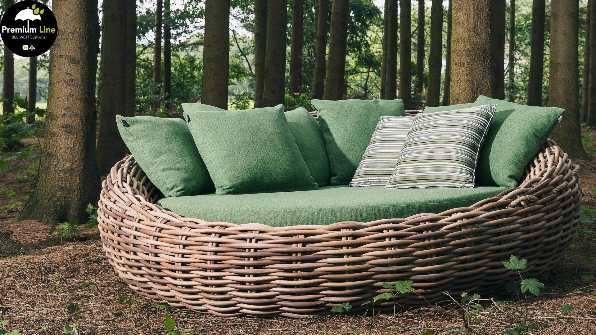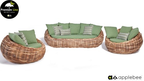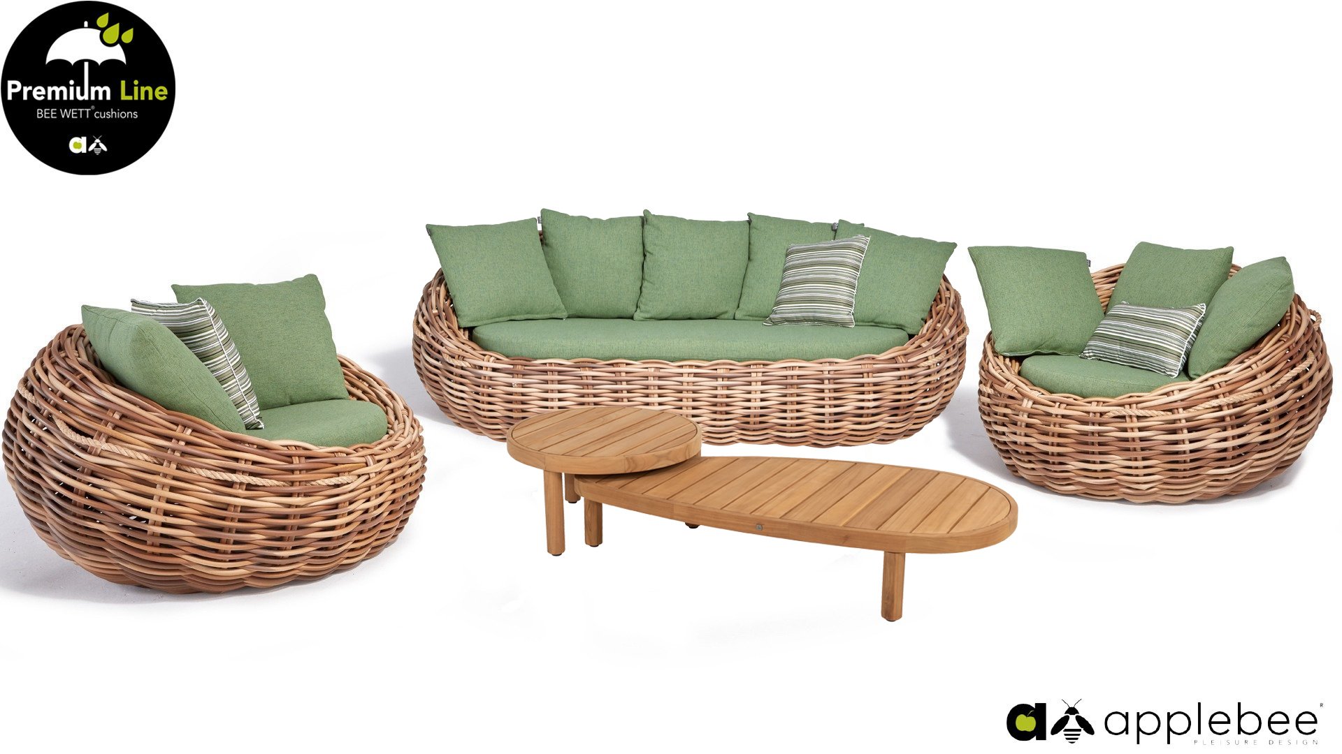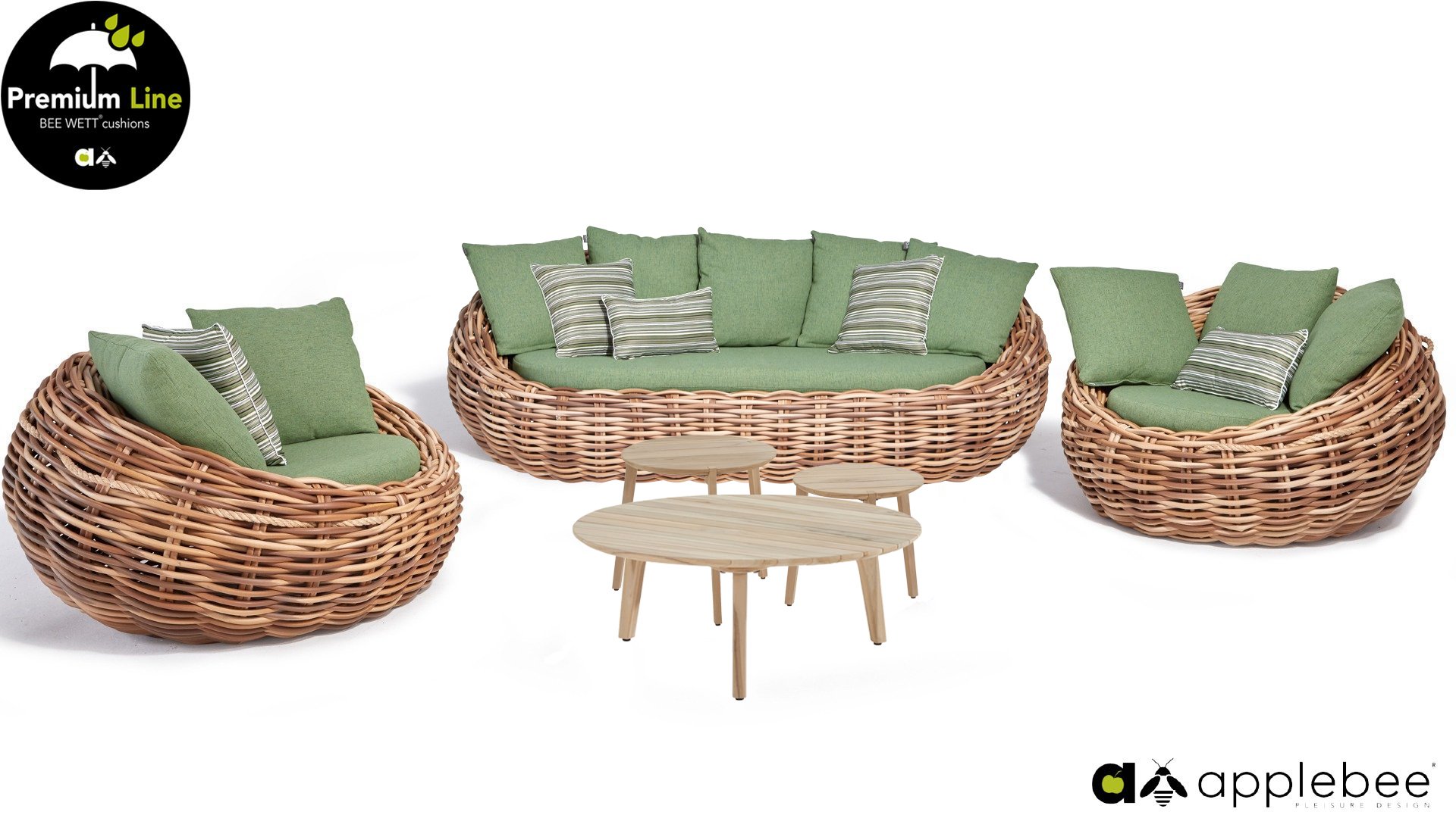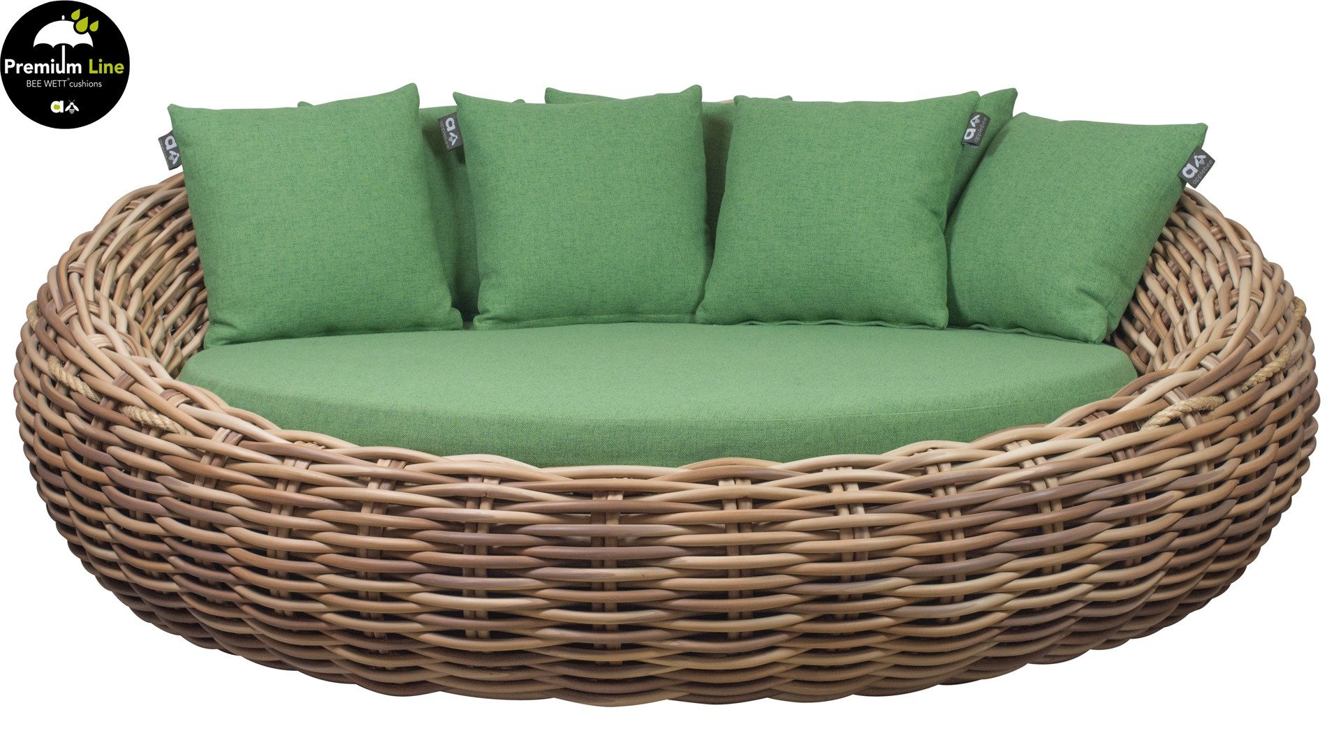Das Comeback! Nicht umsonst wurde der Apple Bee Cocoon Loungegruppe wieder in die Kollektion von Apple Bee aufgenommen, und diesmal in einem hochmodernen Look. Er ist noch immer inspiriert durch den sicheren Kokon, in dem sich eine Raupe geborgen fühlt und sich in einen wunderschönen Schmetterling verwandelt. Wunderschöne grüne Loungekissen mit Bee-Wett®-Technologie in Kombination mit dem außergewöhnlich dicken geflochtenen Biculair®-Flechtfaden in 20mm Stärke. Immer noch in der typischen runden Form, die Sako Wijma beim ersten Cocoon-Design so schön umzusetzen wusste. Ihr eigenes, geborgenes Fleckchen im Garten oder auf der Terrasse.