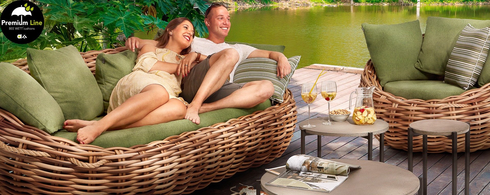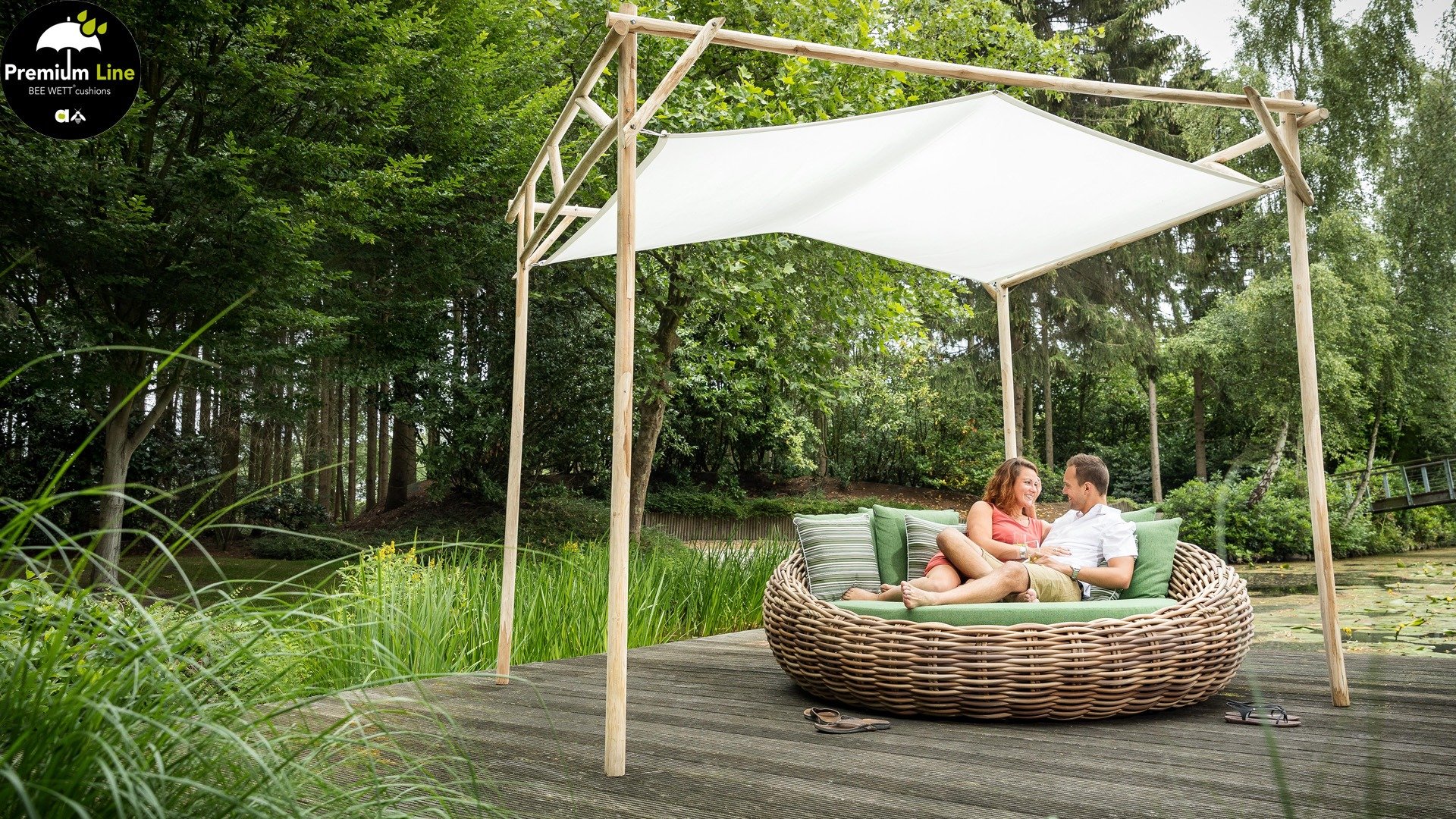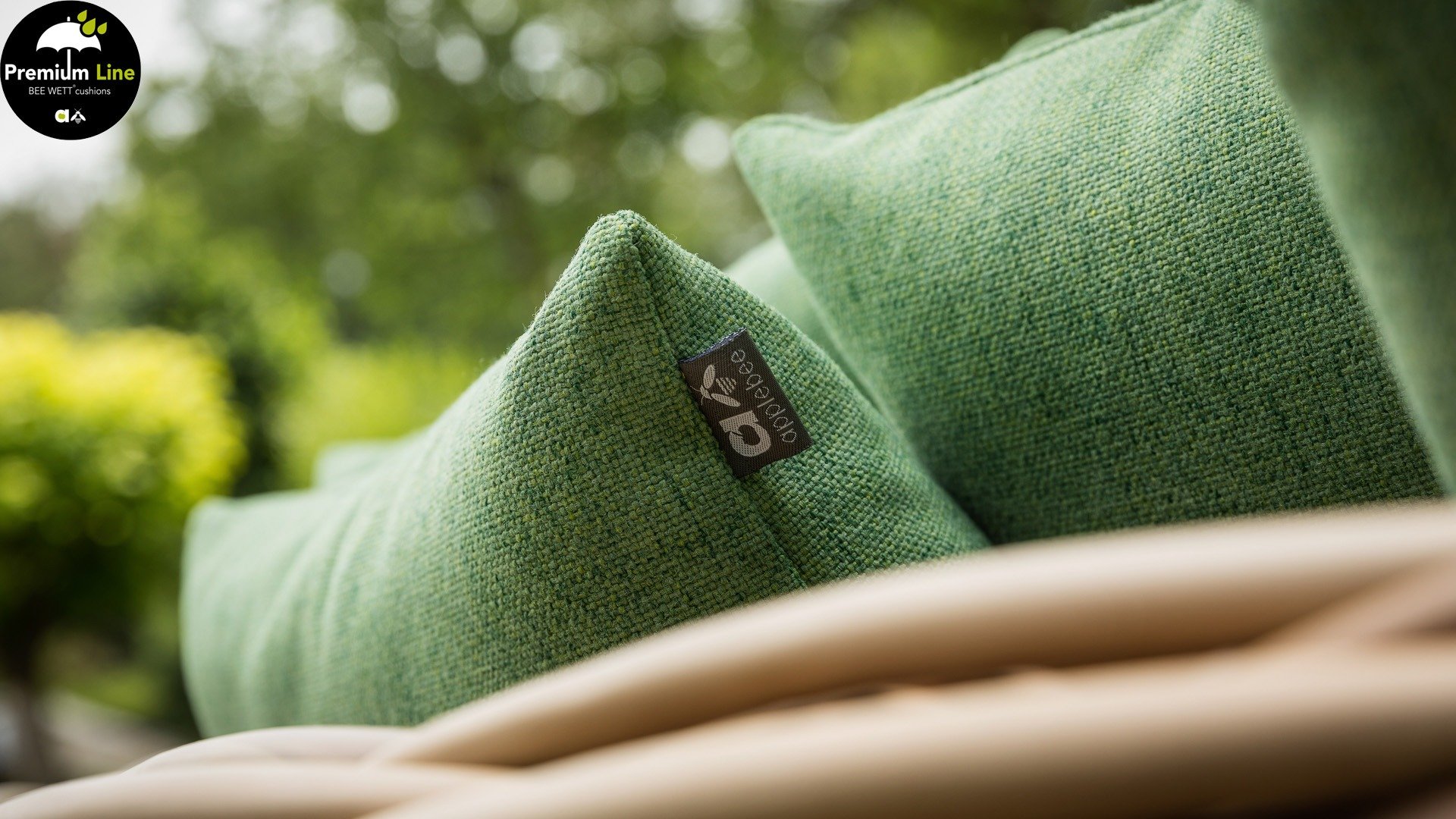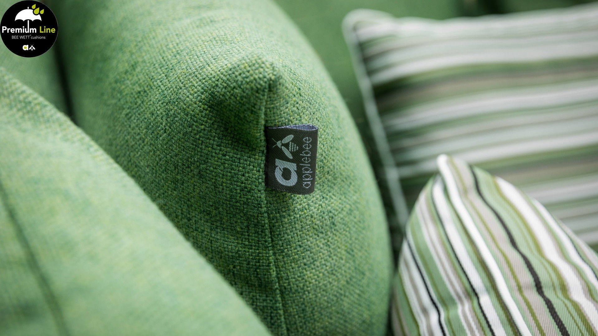 Apple Bee Möbel werden hergestellt aus den besten Materialien. Das gilt ebenso auch für die Kissen und Polster. Bee Wett sind spezielle wetterfeste Kissen die natürlich draussen liegen bleiben können. Die abnehmbaren Hüllen werden aus den bestenmöglichen Stoffen hergestellt und sind alle waschbar. Der Stoff ist zusätzlich wasserabstoßend und garantiert UV-beständig. Anders als bei dem gewöhnlichen Schaum nimmt die einzigartige Bee Wett Füllung keine Feuchtigkeit mehr auf. Eine offenes Gewebe an der Unterseite der Kissen sorgt für eine perfekte Drainage. Der Vorteil, dass die Bee Wett Kissen und Polster unglaublich viel schneller trocknen als vergleichbare andere Kissen. Das Bee Wett-Kissen wird mit einem Olefin Stoff bezogen, der eine gute Beständigkeit gegen Verfaulen und Stockflecken aufweist, und darüber hinaus UV-beständig, weich, komfortabel und feuchtigkeitsabstoßend ist.
