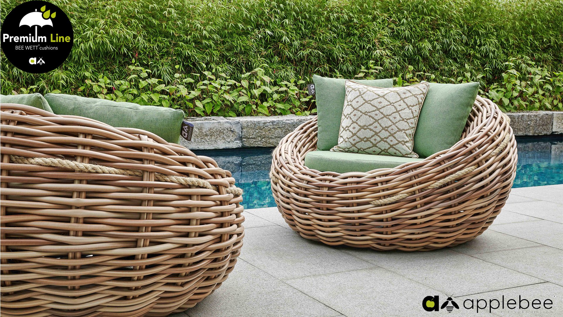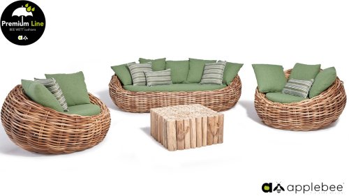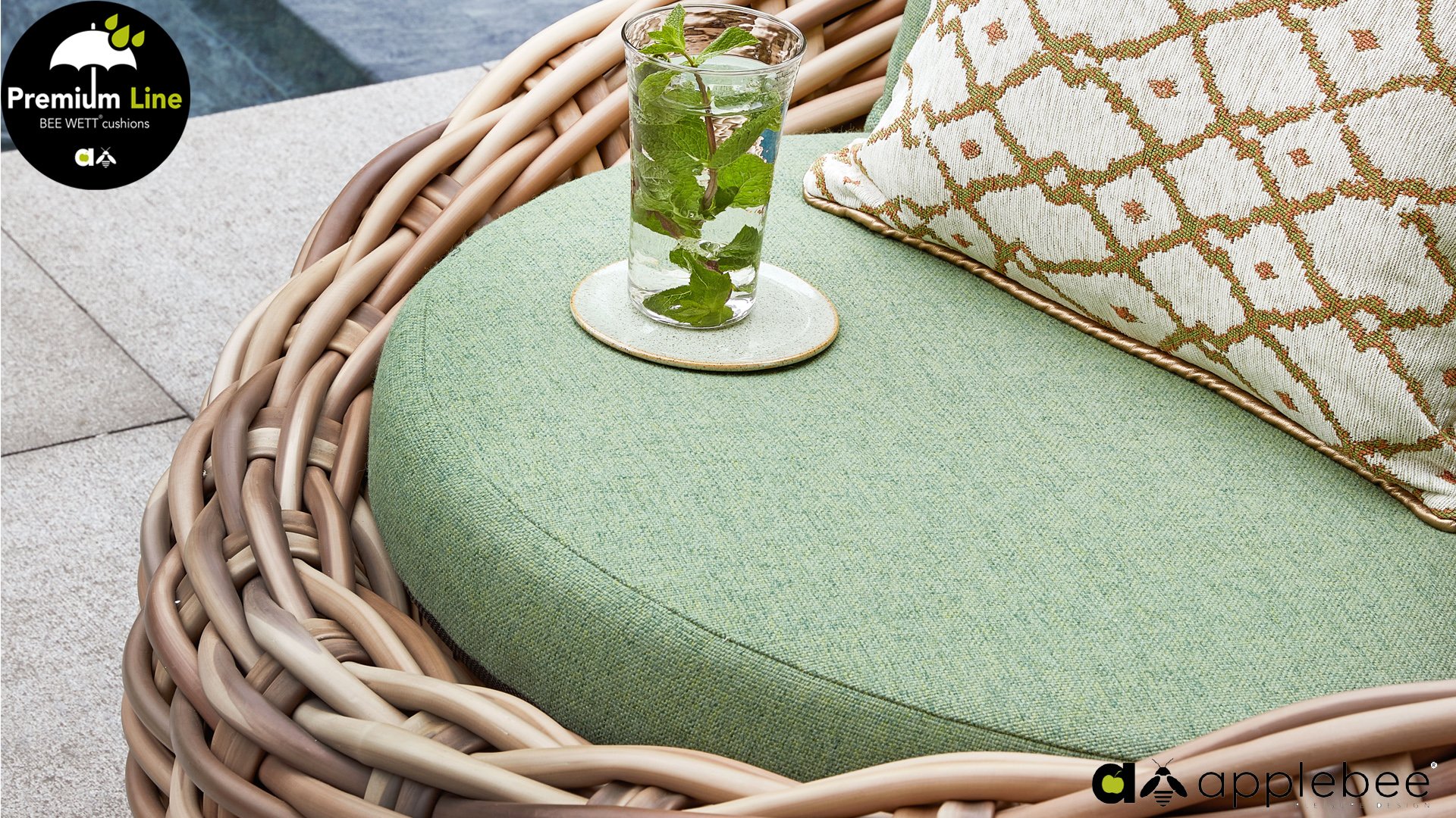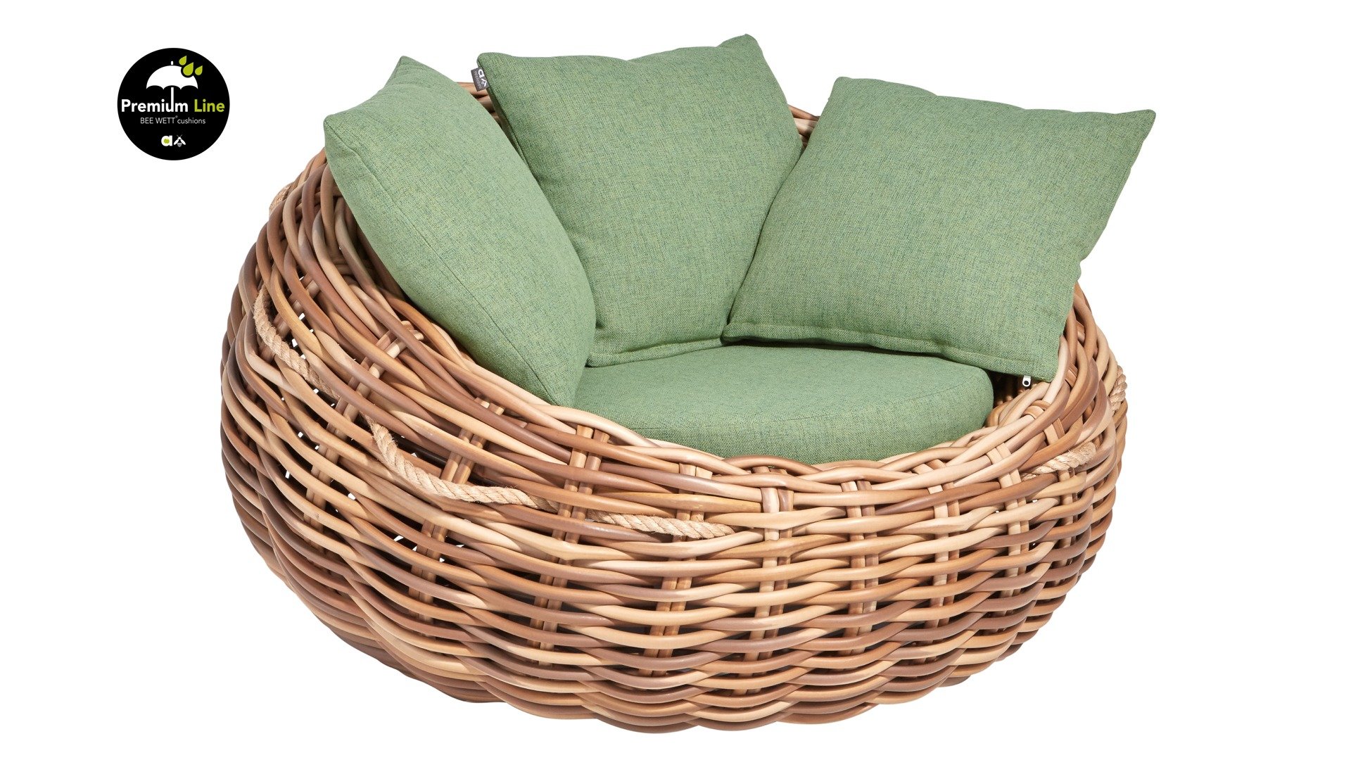 Applebee Cocoon ist inspiriert durch den sicheren Kokon, in dem sich eine Raupe geborgen fühlt und sich in einen wunderschönen Schmetterling verwandelt. Wunderschöne grüne Loungekissen – optional mit Bee-Wett®-Technologie – in Kombination mit dem außergewöhnlich dicken geflochtenen Biculair®-Flechtfaden in 20mm Stärke.