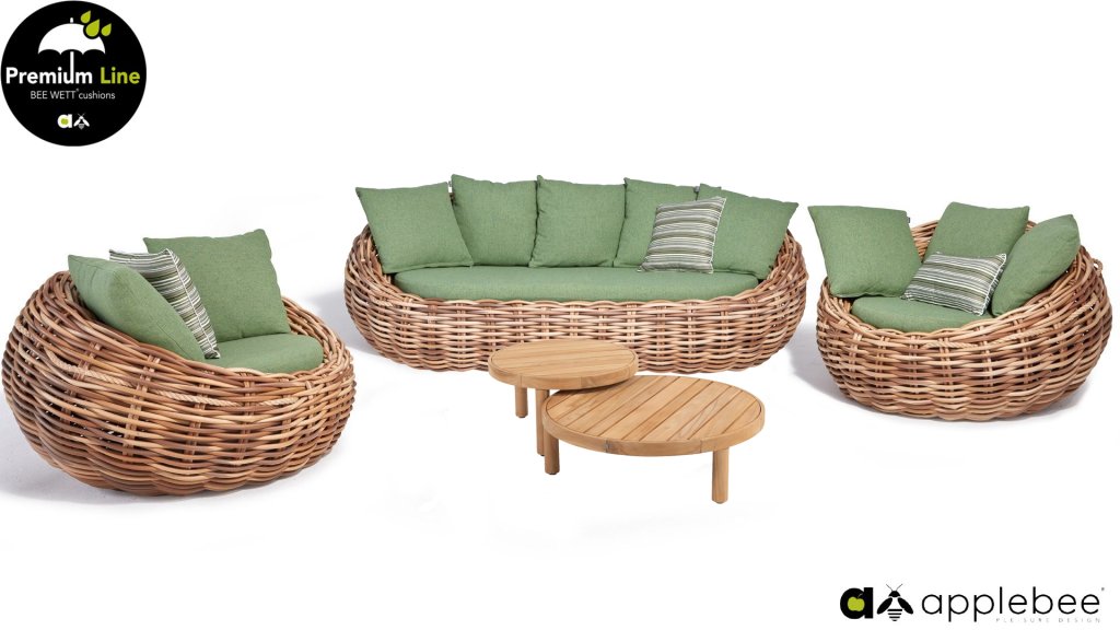 Applebee Cocoon ist inspiriert durch den sicheren Kokon, in dem sich eine Raupe geborgen fühlt und sich in einen wunderschönen Schmetterling verwandelt. Wunderschöne grüne Loungekissen – optional mit Bee-Wett®-Technologie – in Kombination mit dem außergewöhnlich dicken geflochtenen Biculair®-Flechtfaden in 20mm Stärke.