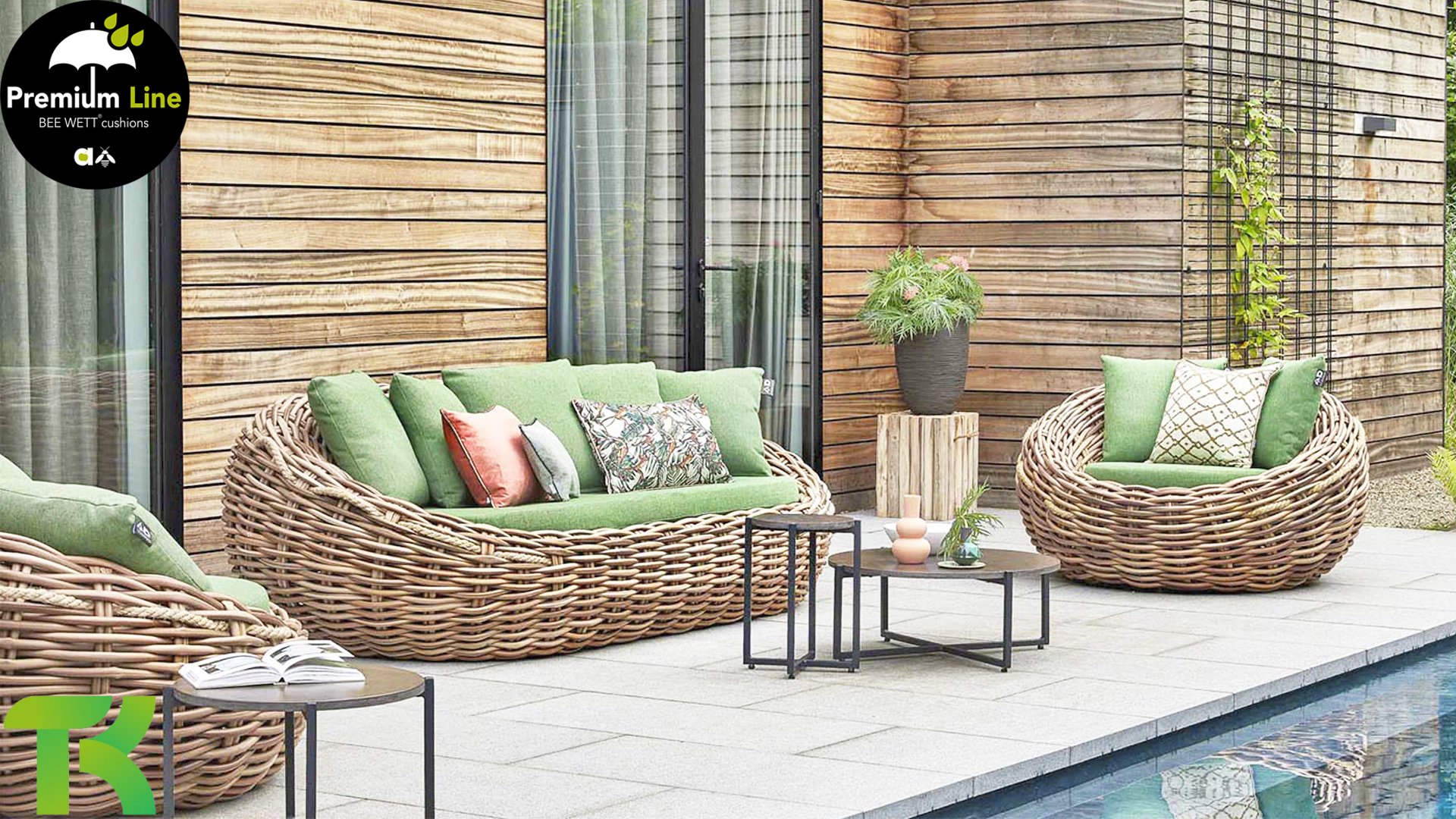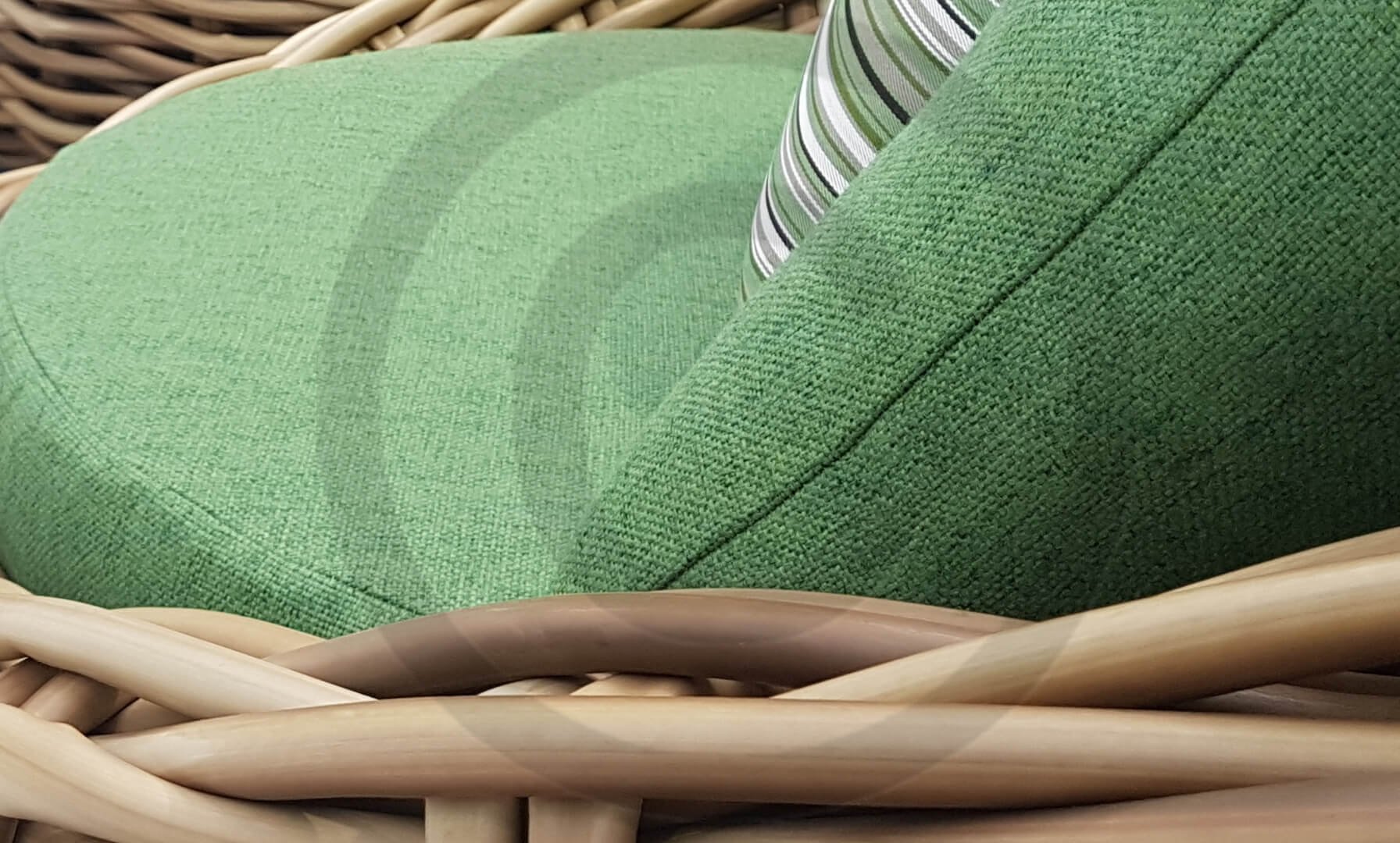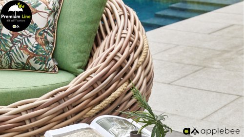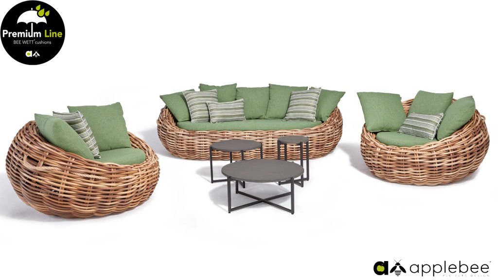 Applebee Cocoon ist inspiriert durch den sicheren Kokon, in dem sich eine Raupe geborgen fühlt und sich in einen wunderschönen Schmetterling verwandelt. Wunderschöne grüne Loungekissen – optional mit Bee-Wett®-Technologie – in Kombination mit dem außergewöhnlich dicken geflochtenen Biculair®-Flechtfaden in 20mm Stärke.
