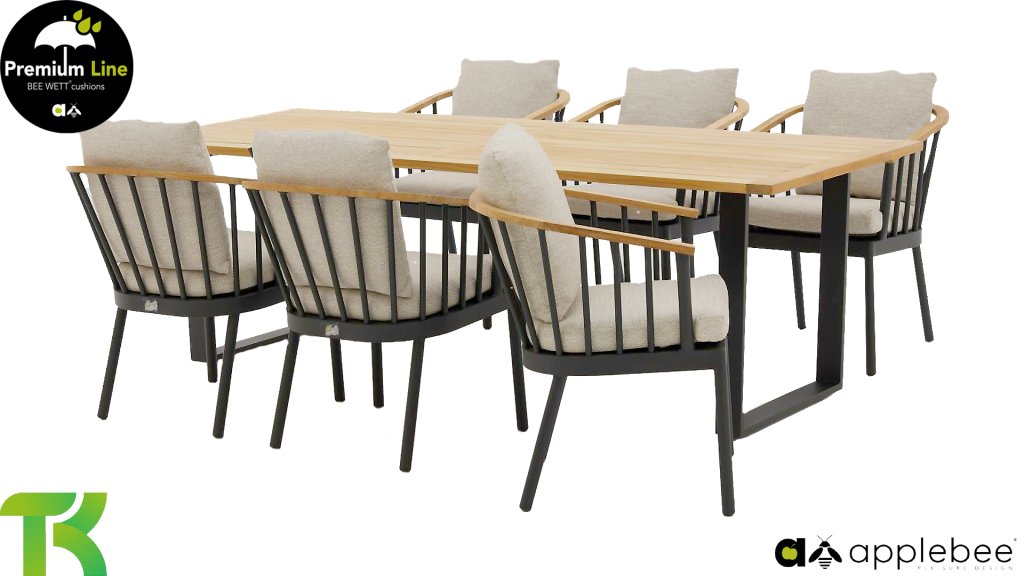 Die Apple Bee Condor Dining Black besticht durch ihr elegantes und robustes Design. Dies spiegelt sich sowohl im Stuhl als auch im Tischgestell wider. Das Gestell besteht aus mattschwarz pulverbeschichtetem Aluminium und zeichnet sich durch seine Stabilität aus. Die BEE WETT® Kissen sind grob gewebt und bieten dennoch ein weiches, bequemes Sitzgefühl. Zusammen mit den formschönen Kurven der Stuhllehne und der Verwendung von natürlichem Teakholz für Tischplatte und Armlehnen verströmt die Condor Essgruppe eine angenehme, natürliche Wärme.