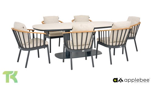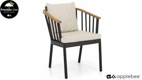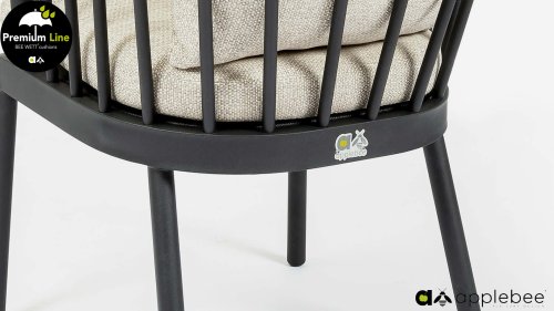 Die Apple Bee Condor Dining Black besticht durch ihr elegantes und robustes Design. Dies spiegelt sich sowohl im Stuhl als auch im Tischgestell wider. Das Gestell besteht aus mattschwarz pulverbeschichtetem Aluminium und zeichnet sich durch seine Stabilität aus. Die BEE WETT® Kissen sind grob gewebt und bieten dennoch ein weiches, bequemes Sitzgefühl. Zusammen mit den formschönen Kurven der Stuhllehne und der Verwendung von natürlichem Teakholz für Tischplatte und Armlehnen verströmt die Condor Essgruppe eine angenehme, natürliche Wärme.