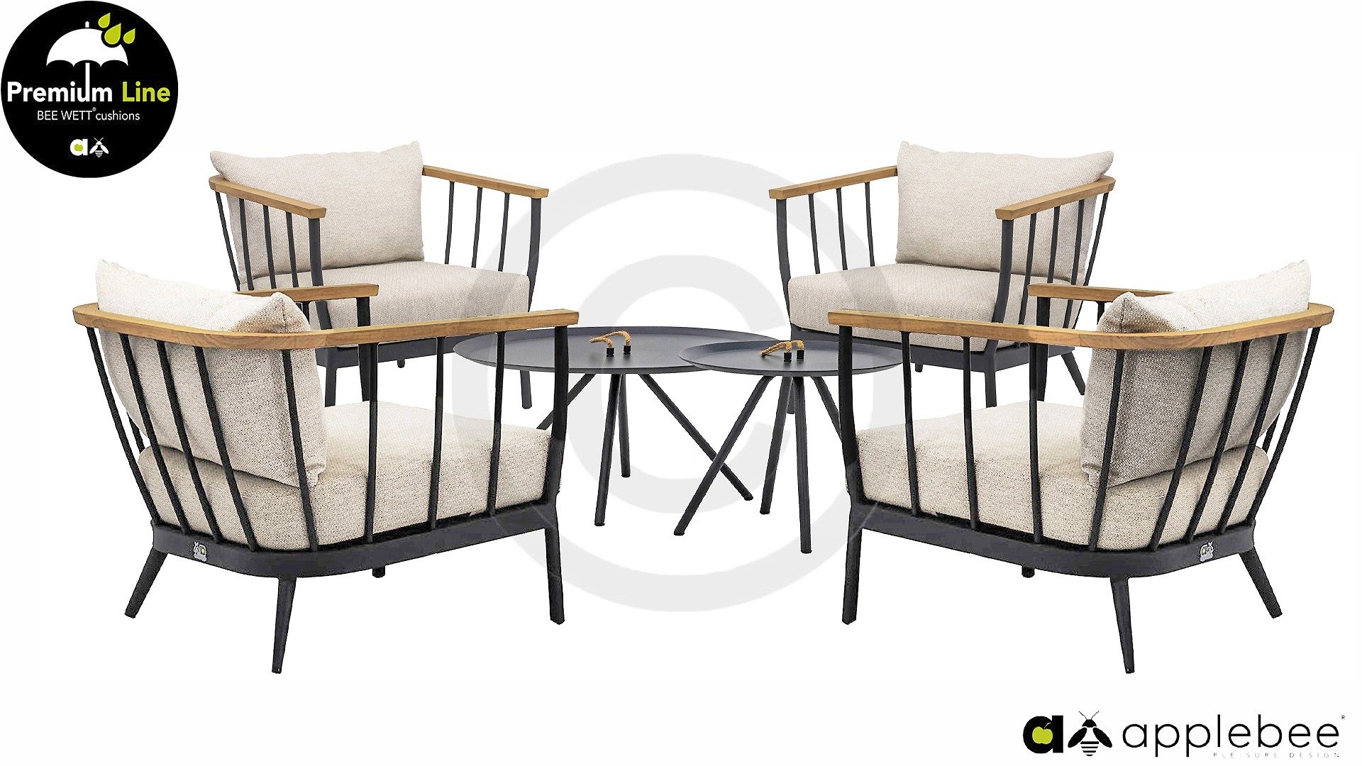 Die Apple Bee Condor Lounge Black ein klares, robustes Aussehen. Das Grundmaterial besteht aus pulverbeschichtetem matt-schwarzem Aluminium. Die BEE WETT® Kissen haben eine grobe Webstruktur, aber mit einem weichen Griff. Die schönen Rundungen im Rücken und der Einsatz von naturbelassenem Teakholz in den Armlehnen verleihen dem Condor eine angenehme natürliche Wärme.