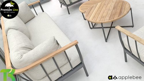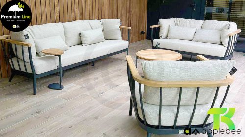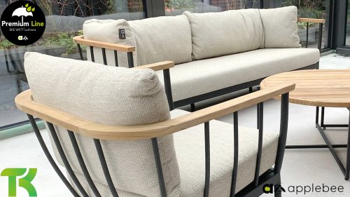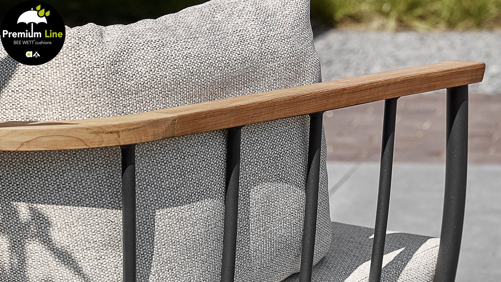 Die Apple Bee Condor Lounge Black ein klares, robustes Aussehen. Das Grundmaterial besteht aus pulverbeschichtetem matt-schwarzem Aluminium. Die BEE WETT® Kissen haben eine grobe Webstruktur, aber mit einem weichen Griff. Die schönen Rundungen im Rücken und der Einsatz von naturbelassenem Teakholz in den Armlehnen verleihen dem Condor eine angenehme natürliche Wärme.