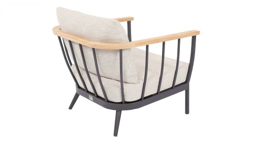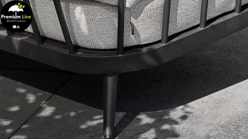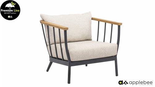 Die Apple Bee Condor Lounge Black ein klares, robustes Aussehen. Das Grundmaterial besteht aus pulverbeschichtetem matt-schwarzem Aluminium. Die BEE WETT® Kissen haben eine grobe Webstruktur, aber mit einem weichen Griff. Die schönen Rundungen im Rücken und der Einsatz von naturbelassenem Teakholz in den Armlehnen verleihen dem Condor eine angenehme natürliche Wärme.